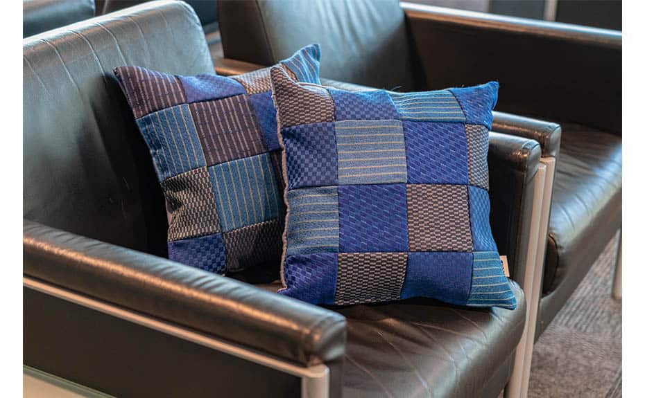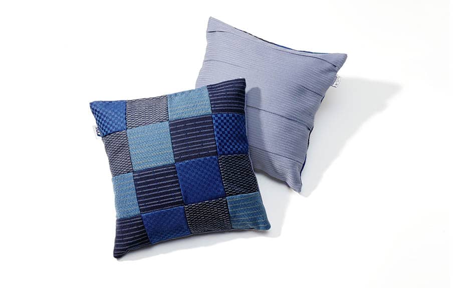 Then, we came up with the idea of sewing the pieces together using a patchwork technique. We had consultations with Onward, and the patchwork cushion was born.