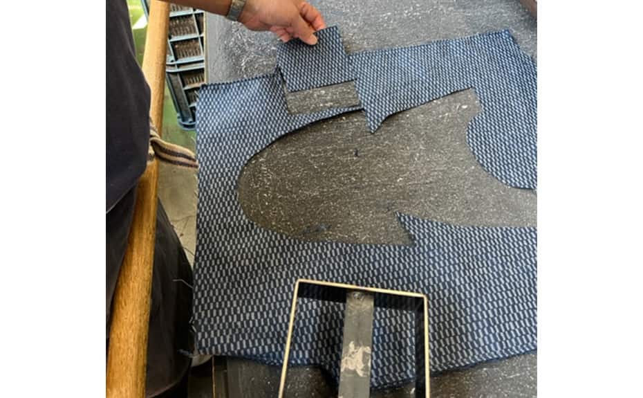 Cutting out square pieces for patchwork cushions from seat cover offcuts left after room shoe production, along with sewing and inspection
