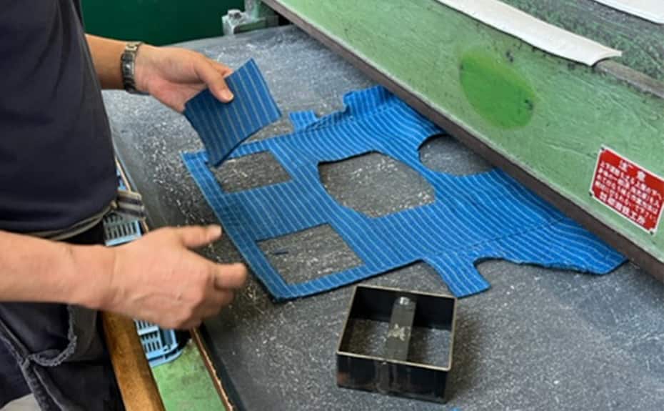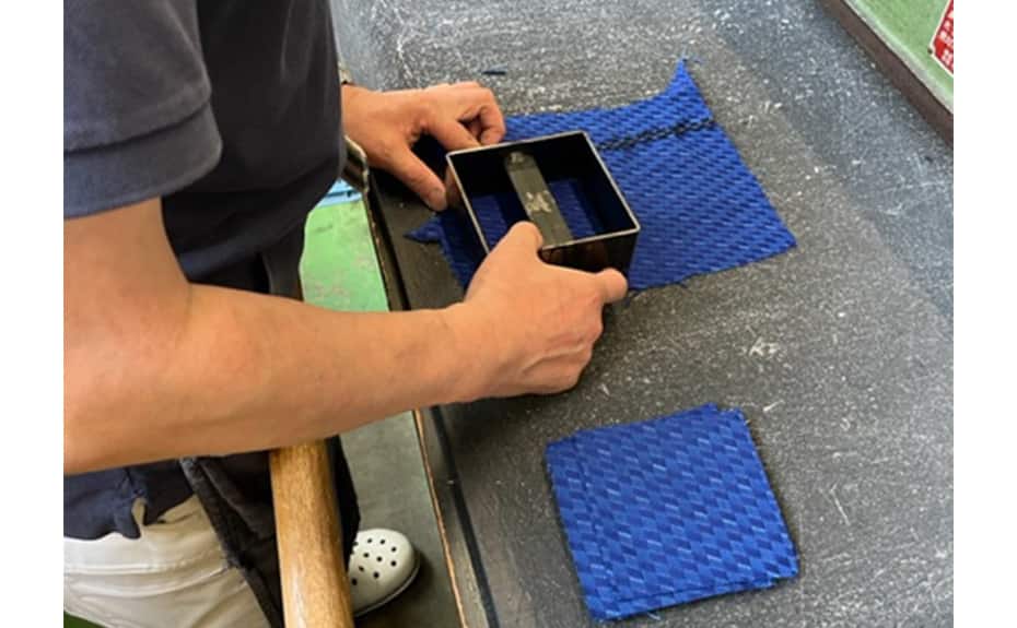 At the factory, Goto Co., Ltd., cooperated by carefully cutting out 11-cm squares one by one from the offcuts and counting them.