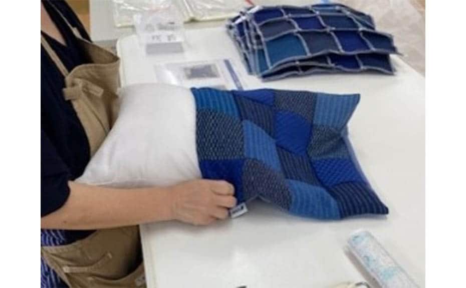 The process ranges from carefully cutting out fabric pieces at a factory in Yamagata Prefecture to sewing and inspecting at a workshop in Hyogo Prefecture. The resulting cushions embody the dedication of the many people involved.