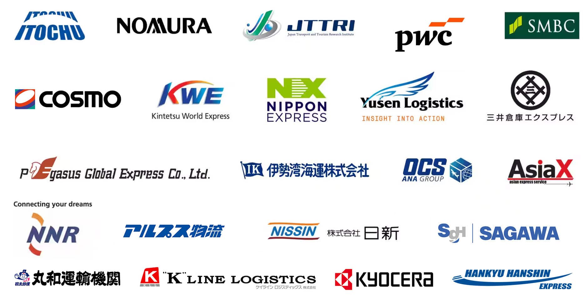 ITOCHU Corporation, Nomura Holdings, Inc., Japan Transport and Tourism Research Institute, PwC Japan LLC, Sumitomo Mitsui Banking Corporation, COSMO ENERGY HOLDINGS Co., Ltd., Kintetsu World Express, Inc., NIPPON EXPRESS Co., Ltd., YUSEN LOGISTICS Co., Ltd., MITSUI-SOKO EXPRESS Co., Ltd., Pegasus Global Express Co., Ltd., ISEWAN TERMINAL SERVICE Co., Ltd., Overseas Courier Service Co.,Ltd., Asian Express Service Co., Ltd., Nishi - Nippon Railroad Co., Ltd., ALPS LOGISTICS CO., LTD., NISSIN CORPORATION, SAGAWA EXPRESS CO., LTD., MARUWA UNYU KIKAN CO.,LTD., "K" LINE LOGISTICS, LTD., KYOCERA Corporation, HANKYU HANSHIN EXPRESS Co., Ltd.