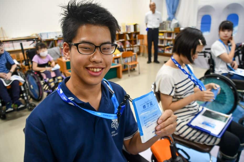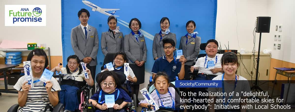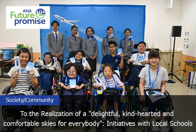 As part of our efforts, we offer "ANA Sorapass Class (Flight Support Class)" for students of special-needs schools as an advance lesson when they take ANA flights for school trips and group travel. In 2017, we received a call from a teacher at a special-needs school asking if we could do a pre-lesson, and in order to respond to the call, staffs who received the call directly went to the school and conducted the class, which was the beginning of the "Sorapass Class". Currently, we have two types of programs: one for students who use wheelchairs and one for students with intellectual and developmental disabilities.