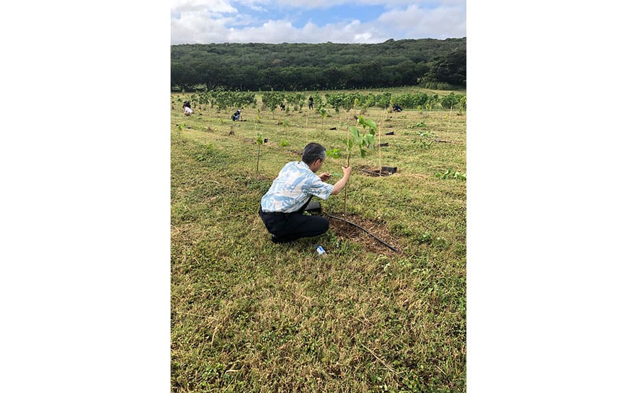 In 2019, we succeeded the tree-planting activity started in "ANA HONOLULU MUSIC WEEK" with the cooperation of Hawaiian Legacy Reforestation Institution(*2), and also in "ANA ʻAha Mele" this year, ANA Group employees planted 260 milo trees.Miro trees are a type of Hawaiian wood that is sometimes used for the body of ukuleles, symbolizing the concept of "ANA ʻAha Mele" to value music and culture. In addition, since one milo tree can supply oxygen for a family of four staying at the site for one week, and we decided to plant 260 trees to commemorate the event, which was calculated by multiplying the duration of the event (two days) by the capacity of the Airbus A380 "FLYING HONU" (520 passengers/plane) and dividing by 4.