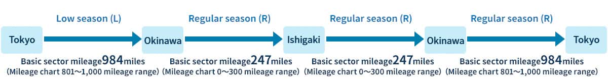 For itineraries involving flights to/from outlying islands in Okinawa Prefecture (Miyako or Ishigaki) with a connection in Naha, the required mileage will be confirmed by calculating the itinerary mileage (the total of each basic sector mileage).