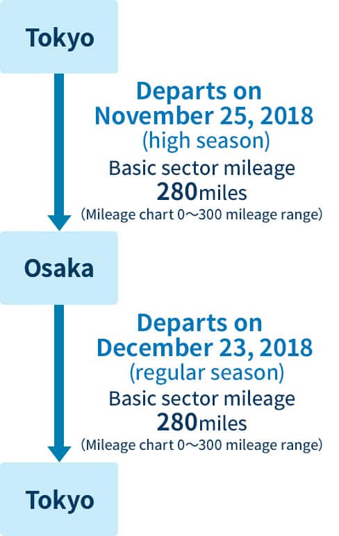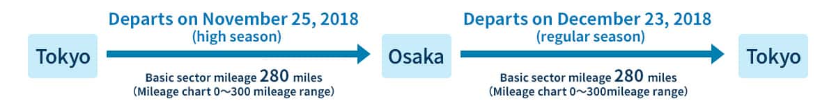 1st sector (Tokyo-Osaka): Departs on November 25, 2018 (high season); Basic sector mileage: 280 miles