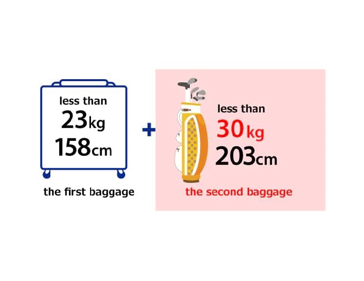 1 piece of baggage (within 23 kg/50 lb, total linear dimensions within 158 cm/62 in.) and 1 golf bag (within 30 kg/66 lb, total linear dimensions within 203 cm/82 in.)