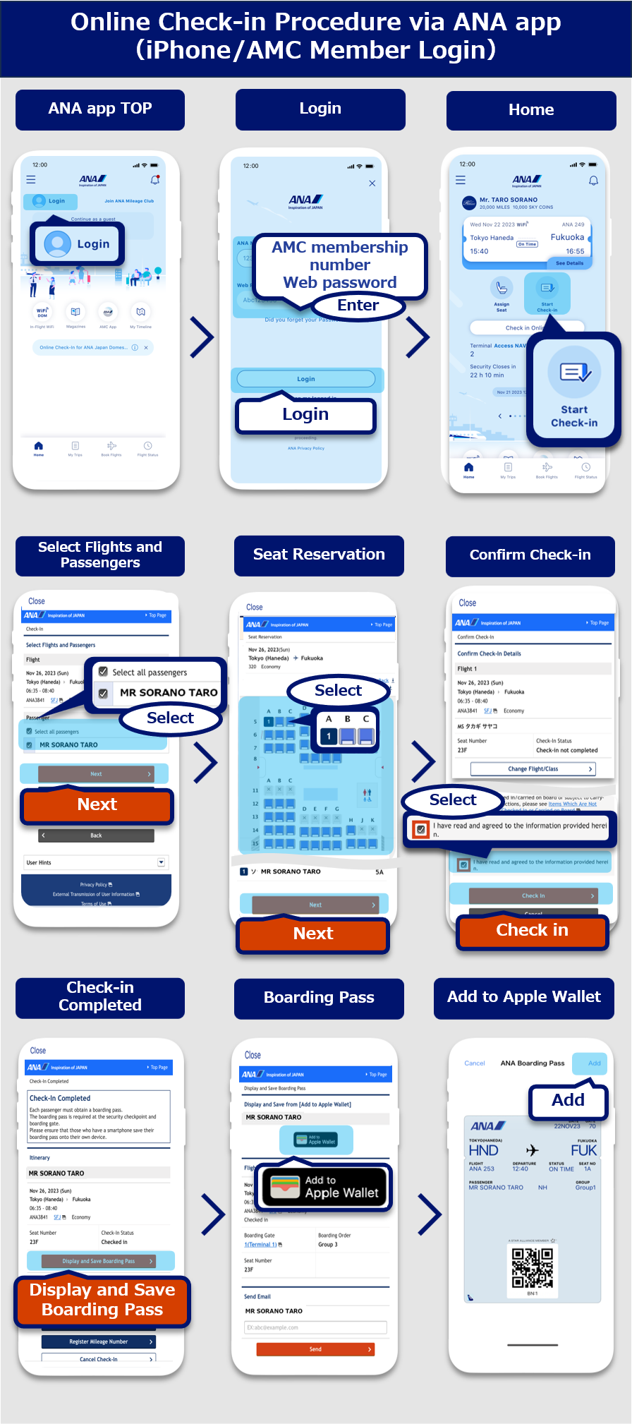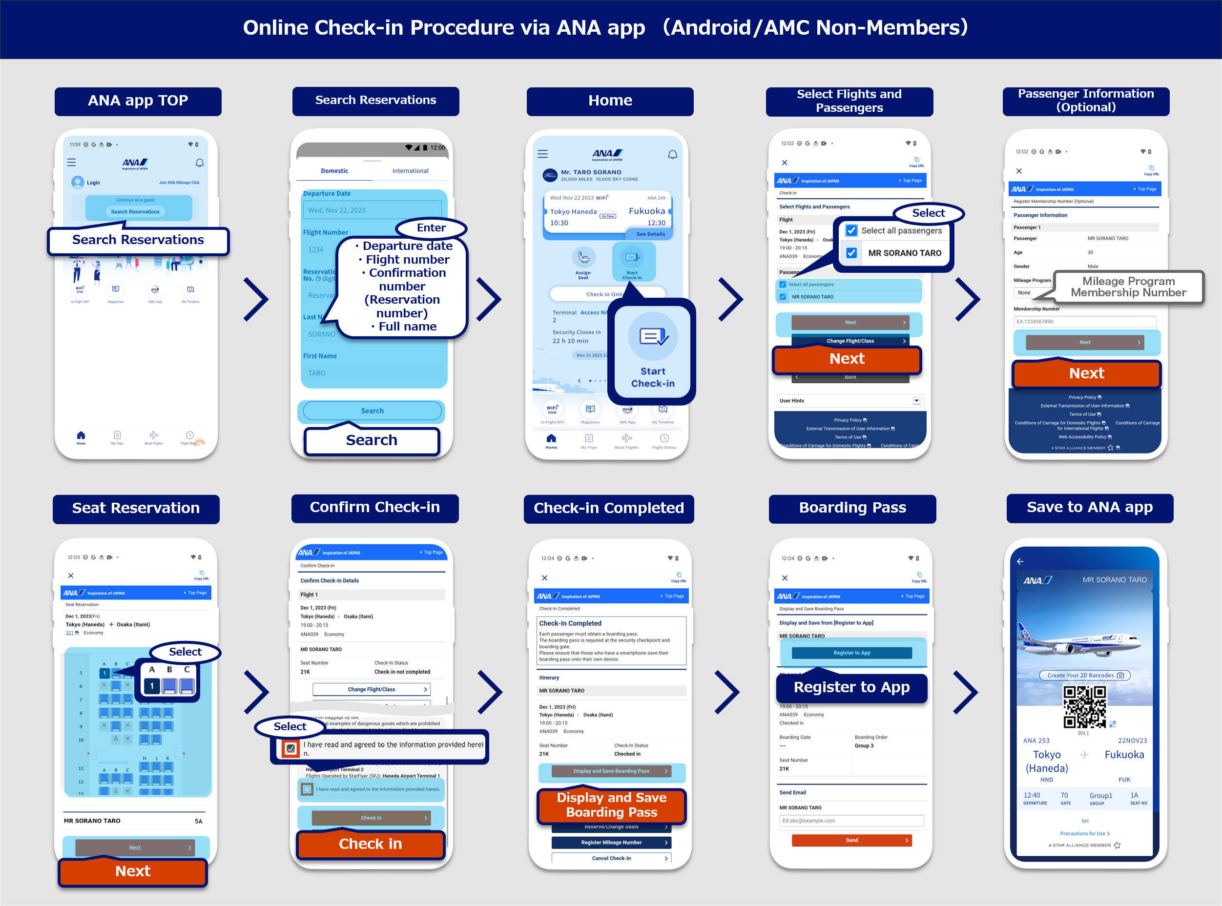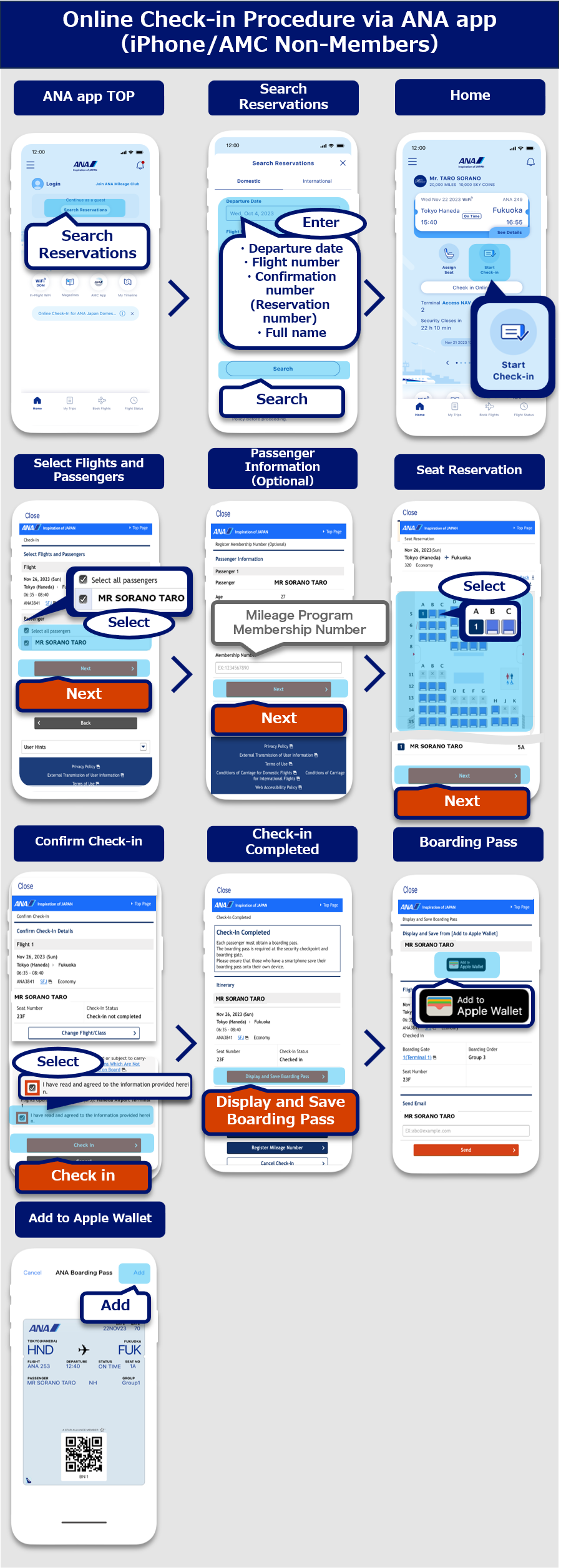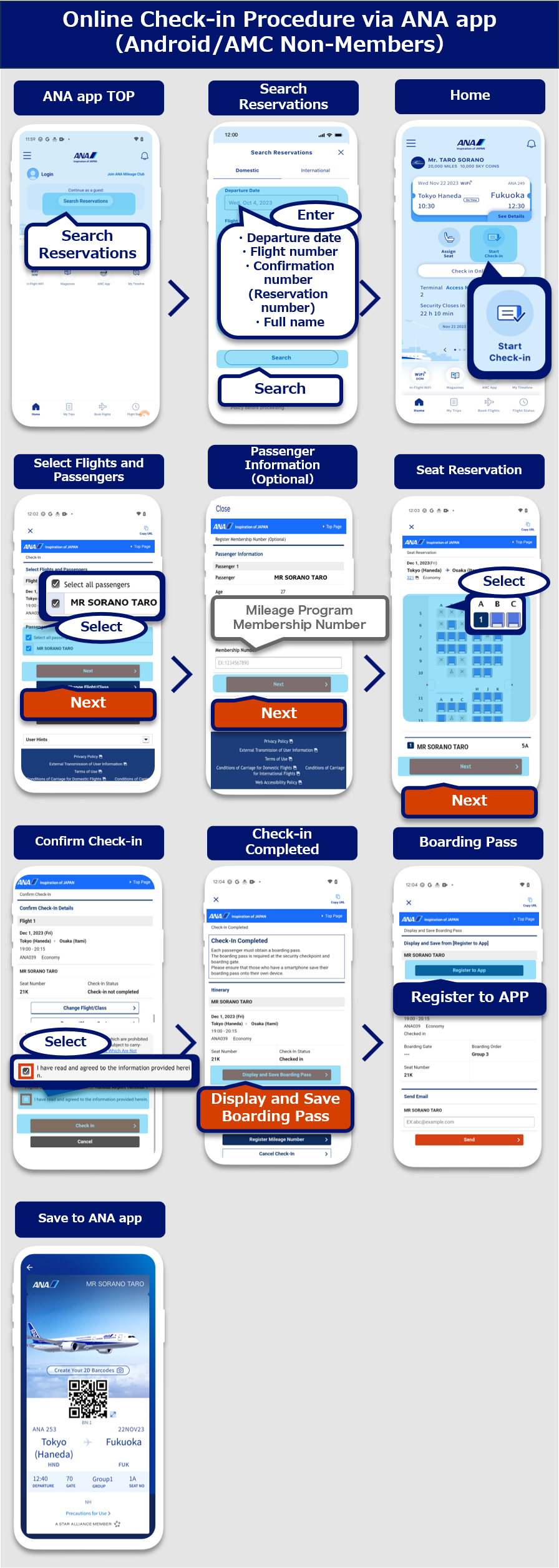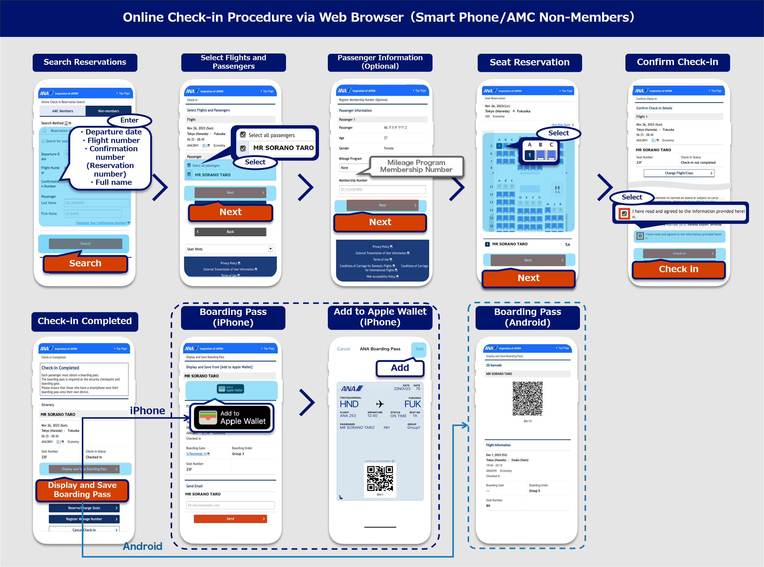 | 10-digit ANA Mileage Club membership number and web password | Departure date, flight number, 9-digit confirmation number or 4-digit reservation number, and full name |