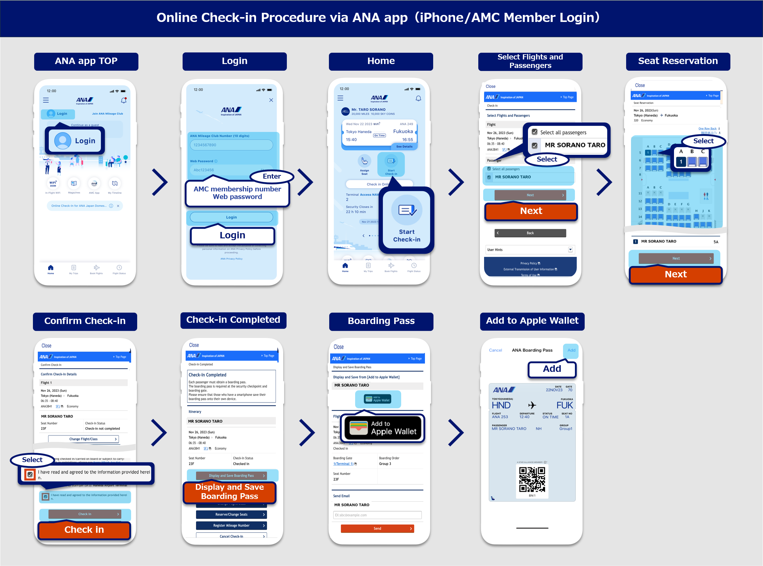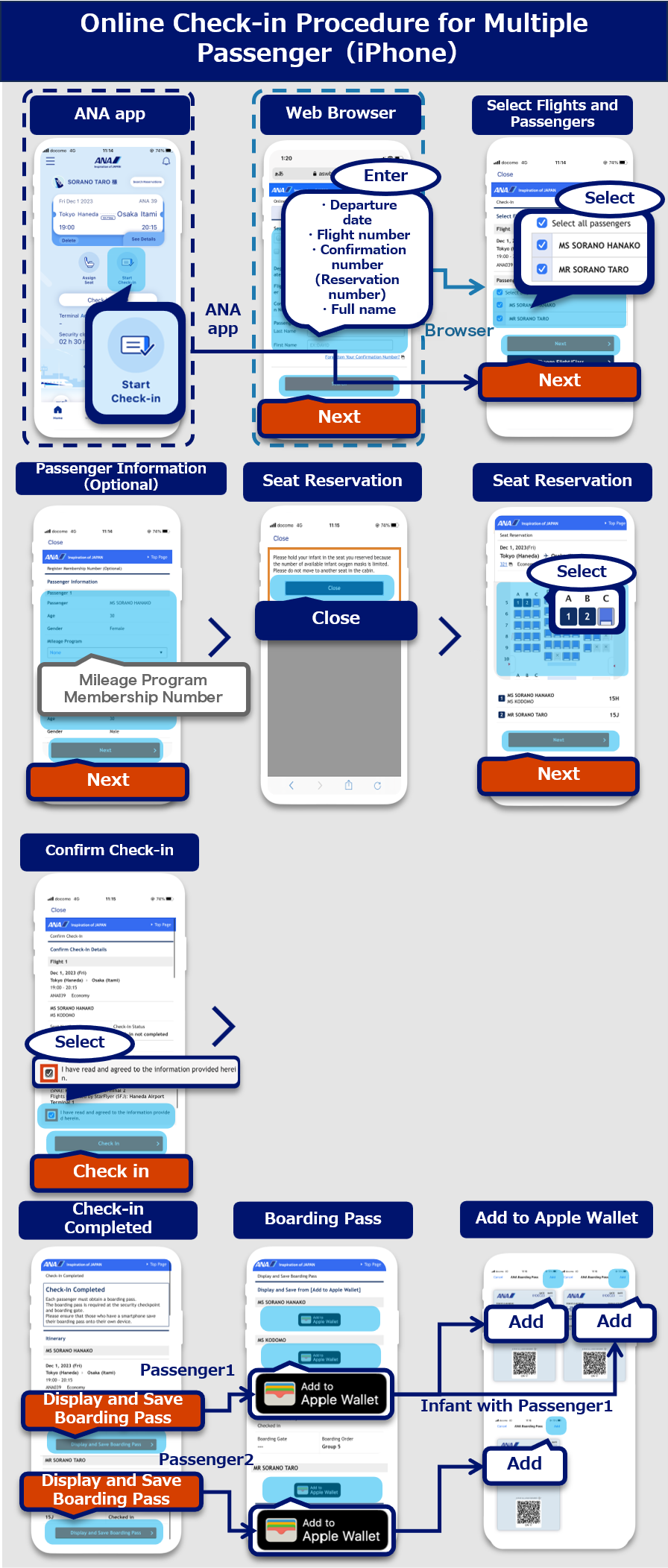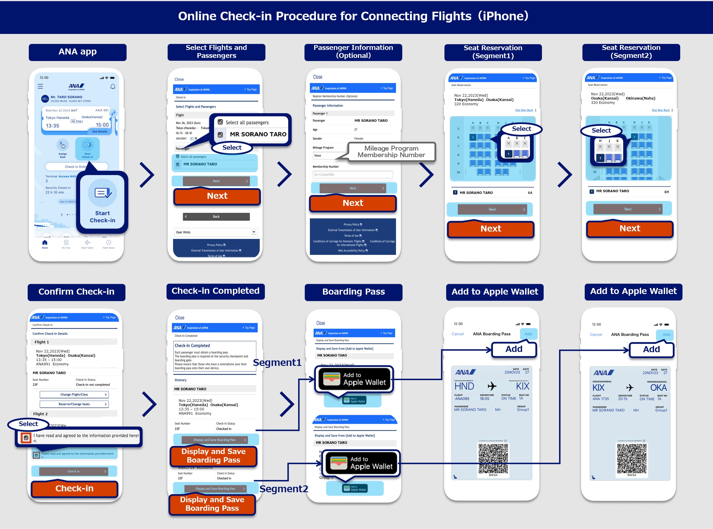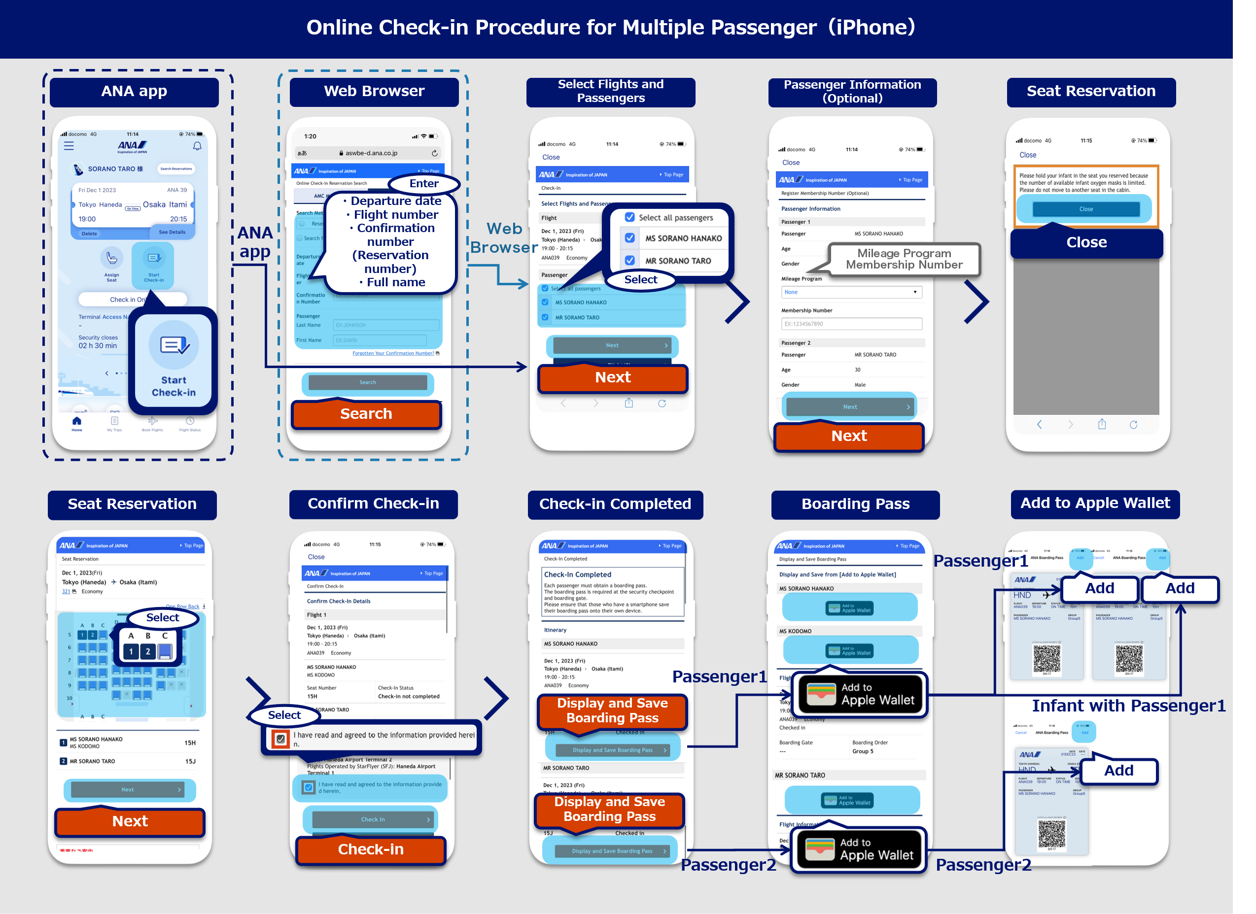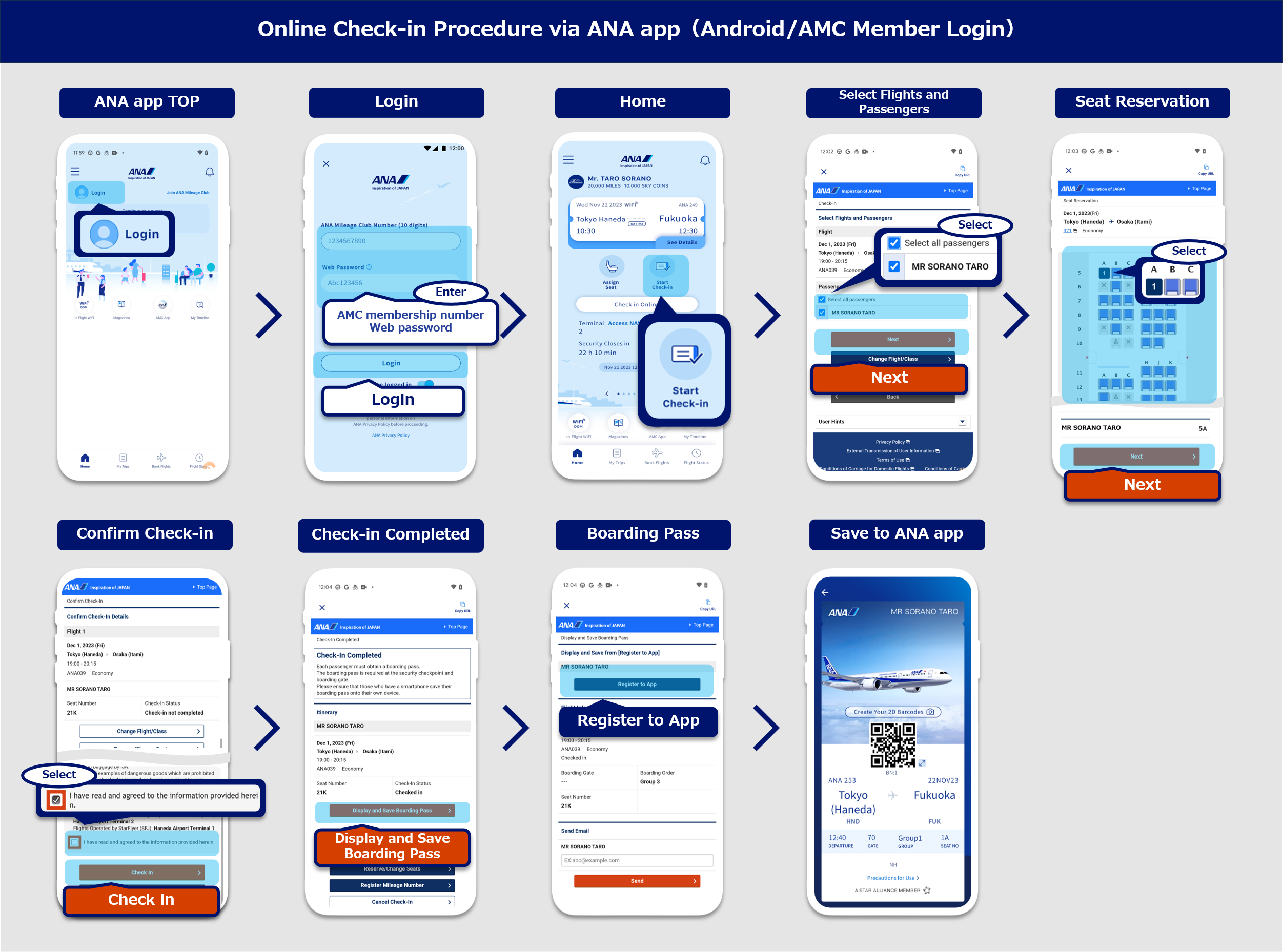 | 10-digit ANA Mileage Club membership number and web password | Departure date, flight number, 9-digit confirmation number or 4-digit reservation number, and full name |
