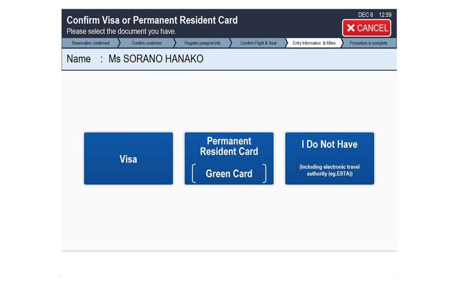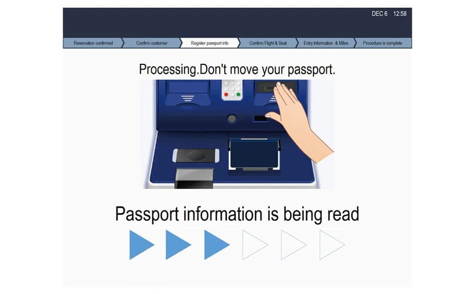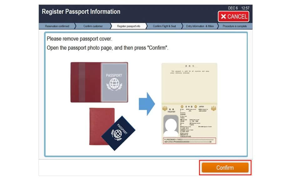 Please place your passport on the scanner in accordance with the on-screen instructions. The passport must have been registered to your reservation information in advance. Upon pressing Confirm, scanning will commence.