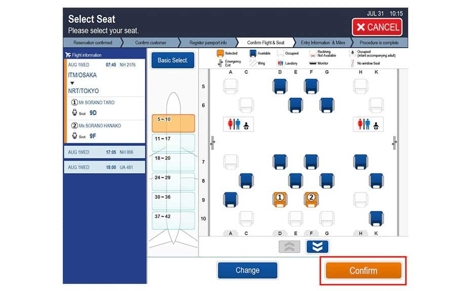 Please confirm your selected seat, and then press Confirm.