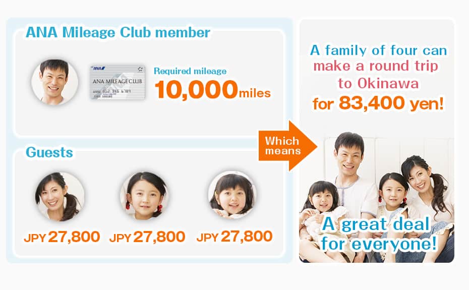 Tokyo=Okinawa for four family members (One way fare amount in the normal period : JPY 13,900).