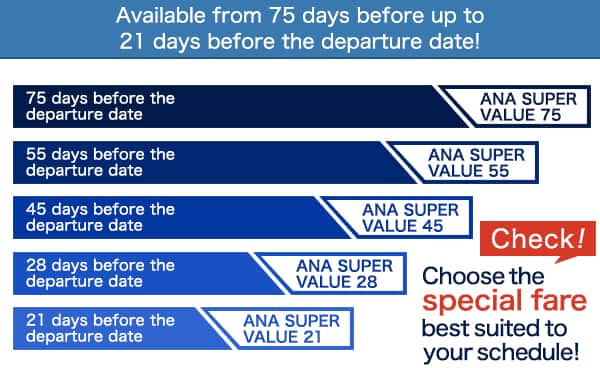ANA SUPER VALUE is a variable fare dependent on estimated seat availability. You will be shown the cheapest fares available for your reservation/purchase. These fares will depend on the estimated number of seats available for each flight and the reservation date. For details, please see Fares Depending on Seat Availability.