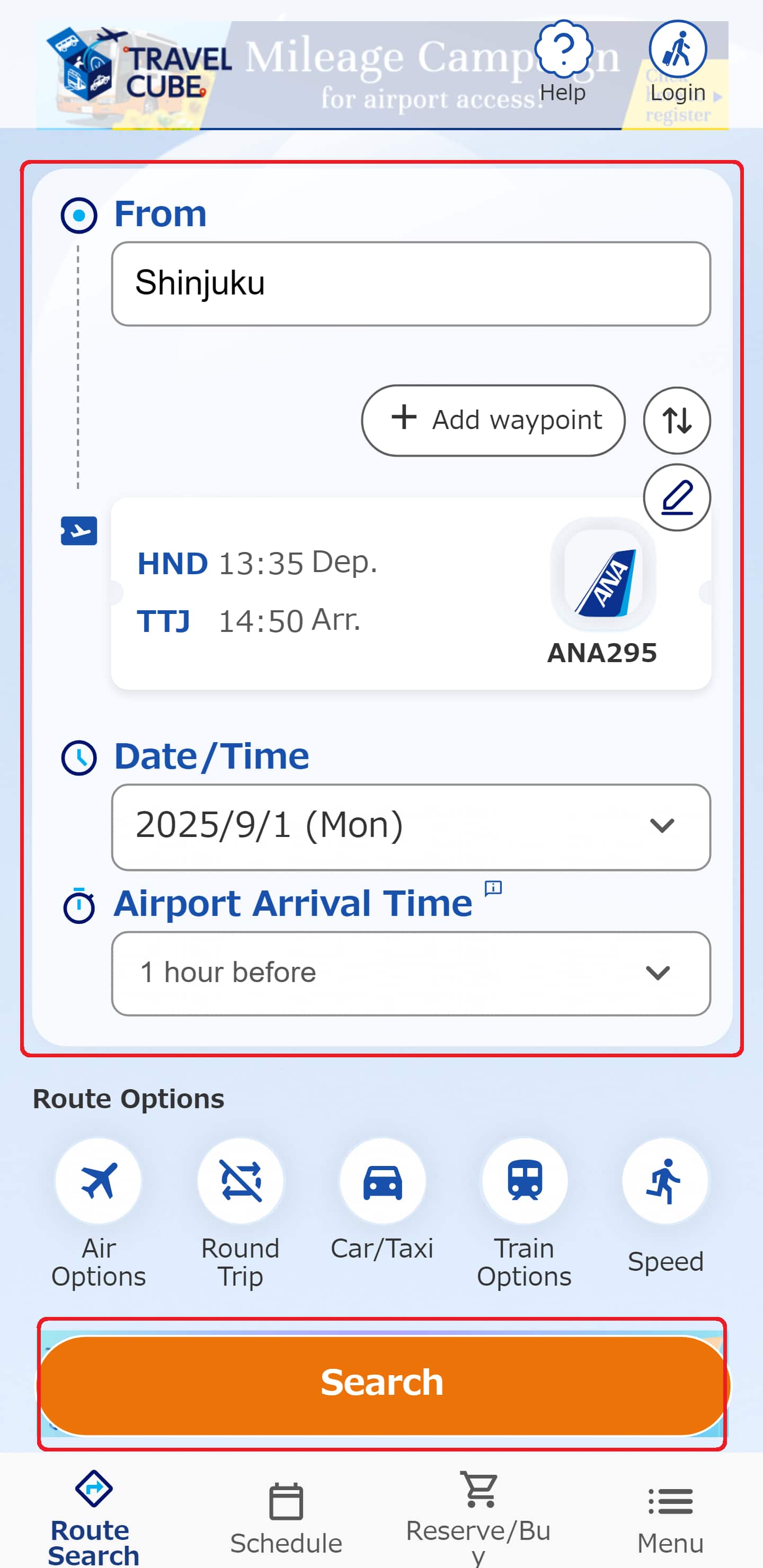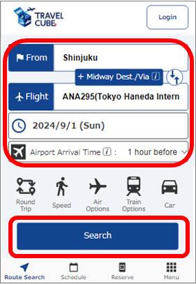 Search between any destination (home, office, hotel, tourist destination, etc.). If flights are included in the search results, you can search for routes that reflect real-time flight information, and check information about boarding terminals, security checkpoints, and boarding gates. ANA flights (including codeshare flights) as well as other flights are eligible.