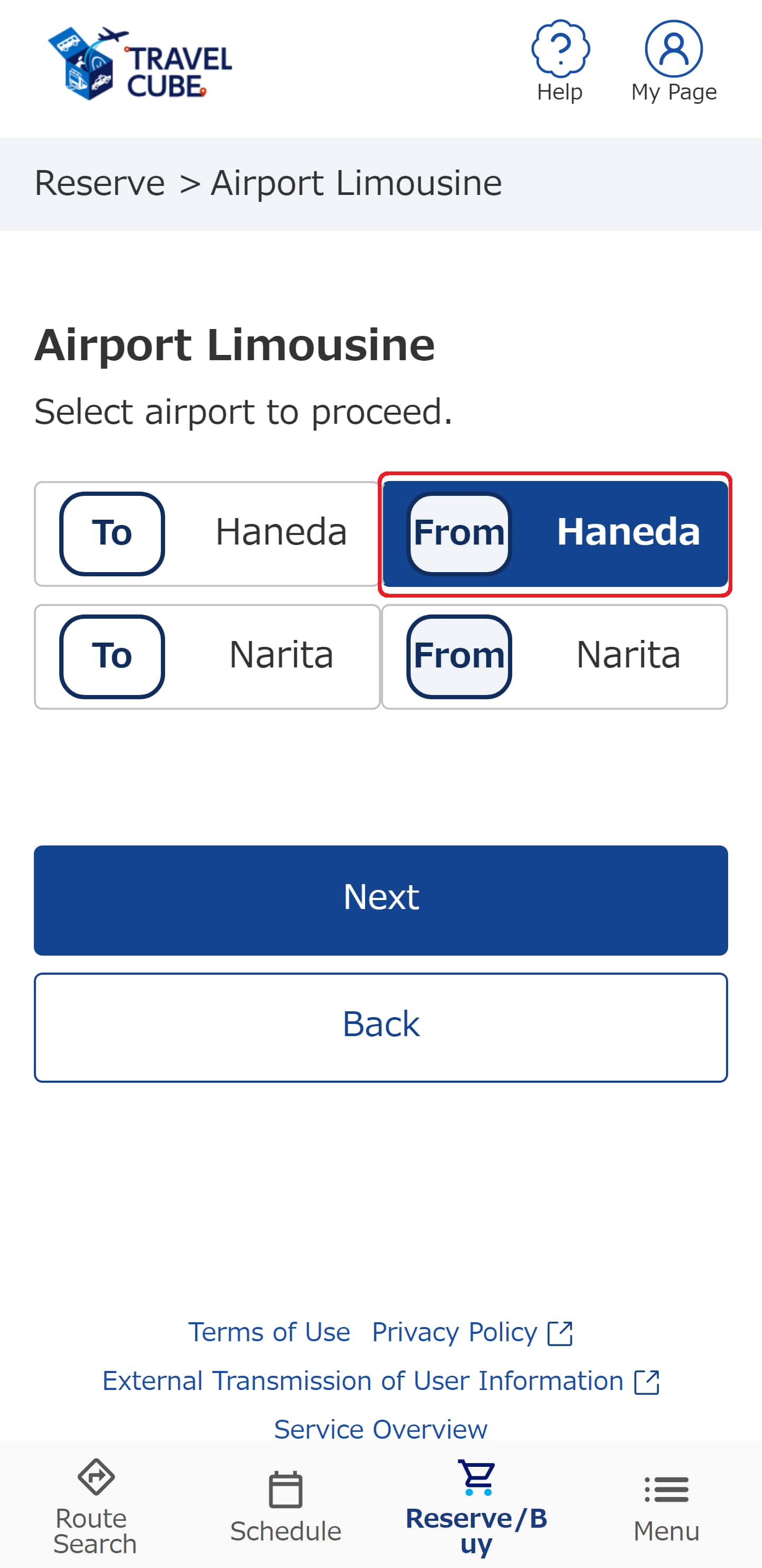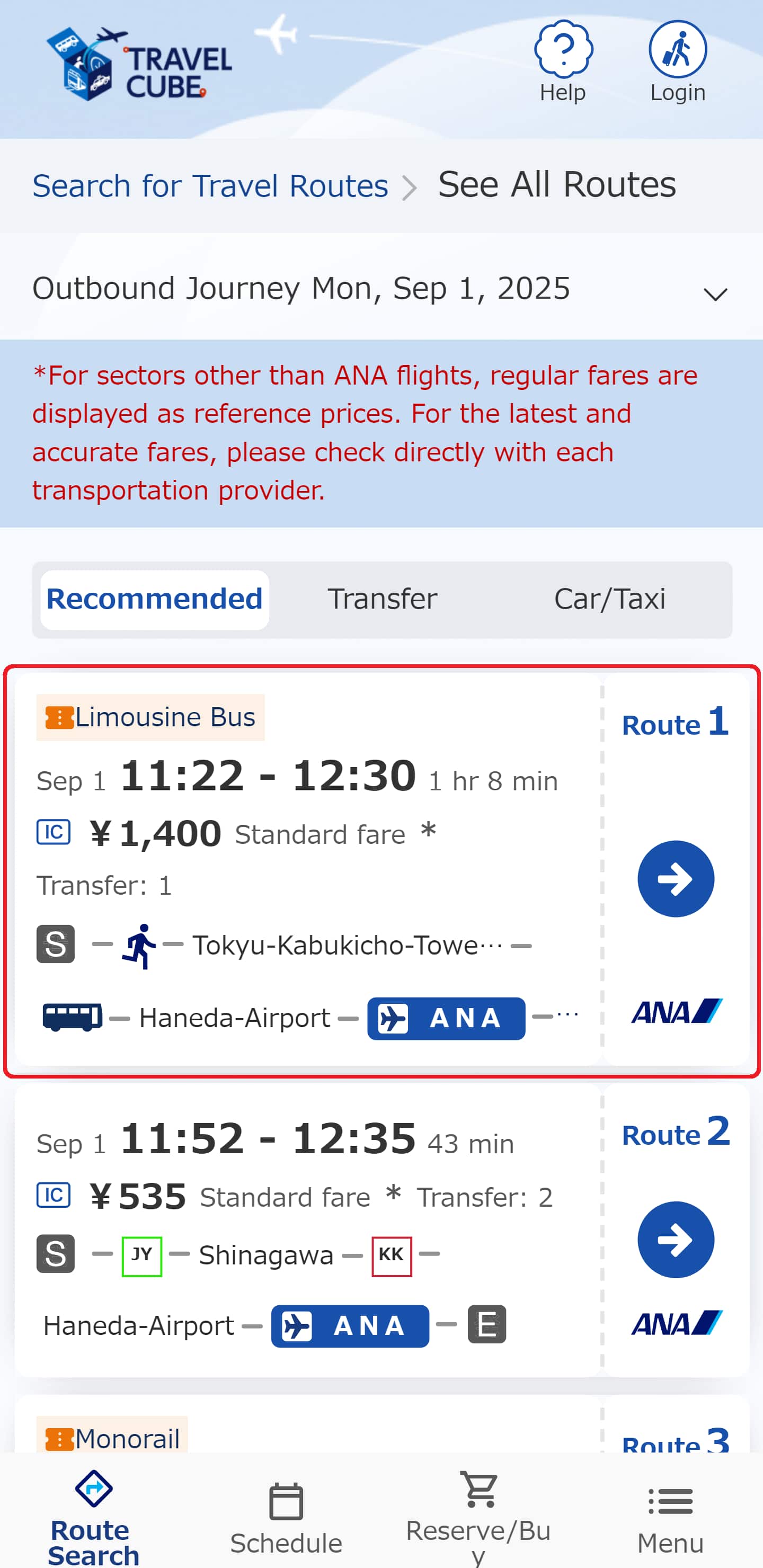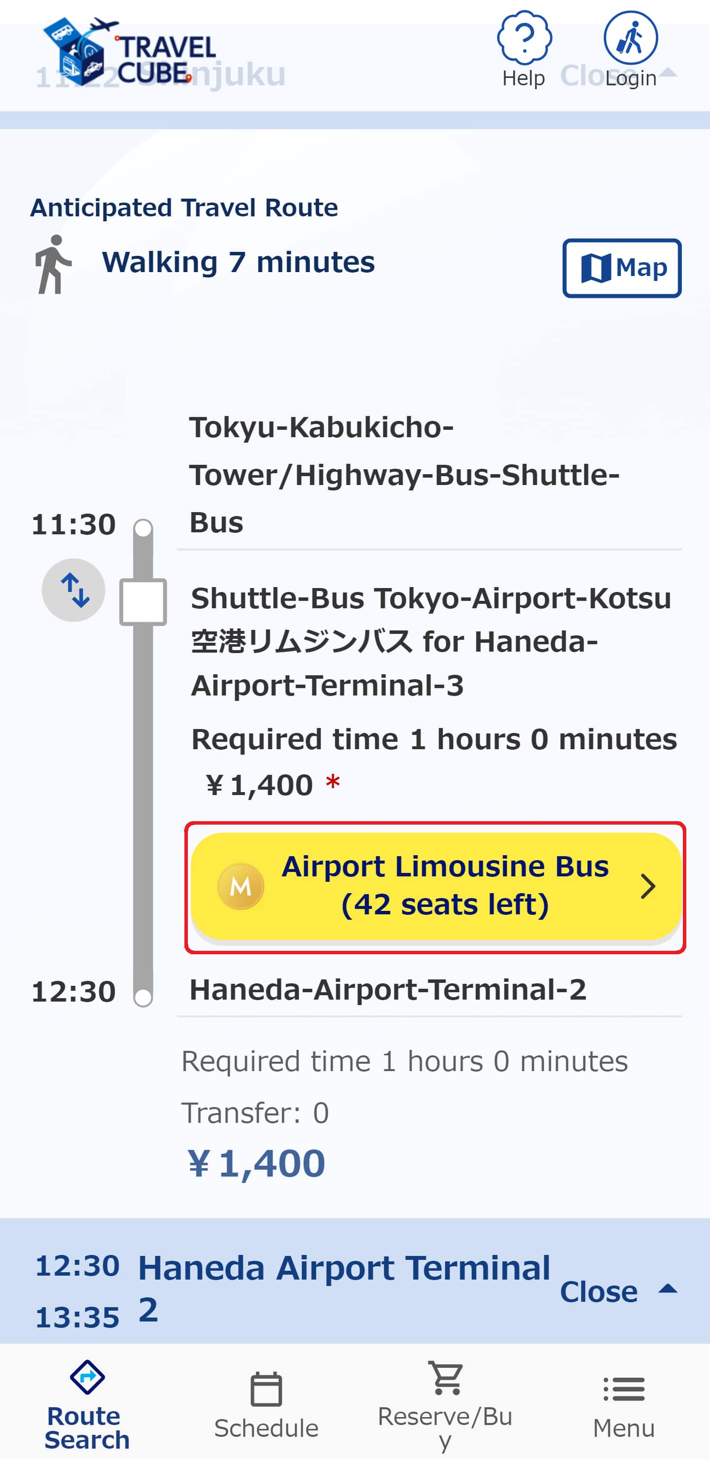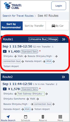 From the list, select a route that uses the limousine bus service and proceed to route details.
