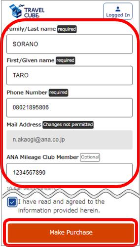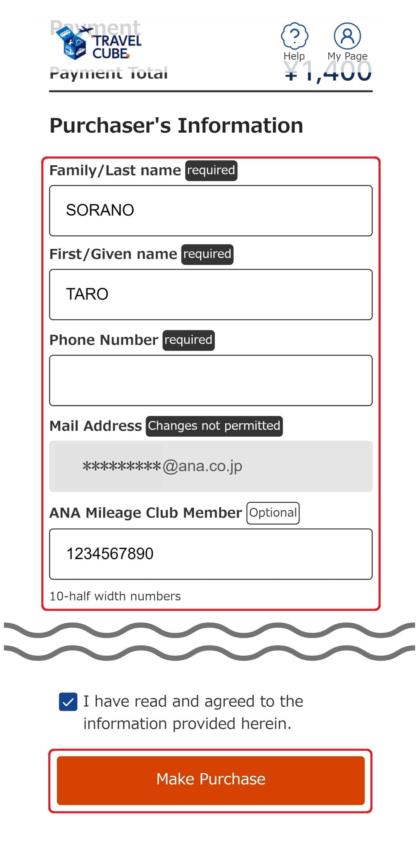 ANA Mileage Club membership numbers cannot be corrected after the purchase is made and retroactive mileage registration is not available, so please be sure to enter your information correctly upon making your reservation.