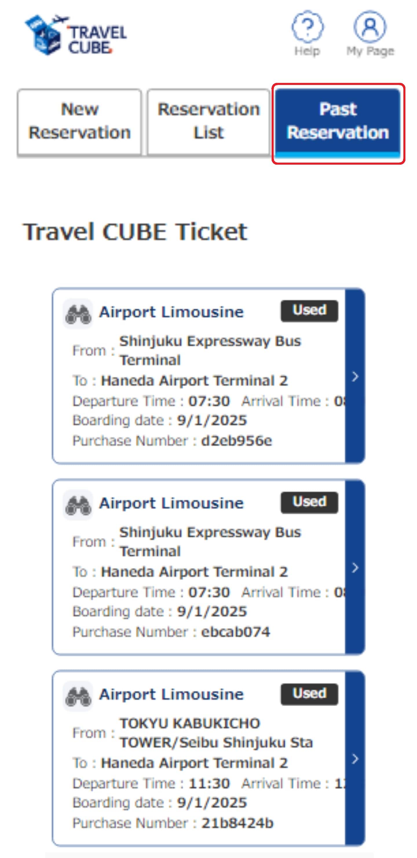 Used tickets can be viewed and receipts can be issued in Travel CUBE's Past Reservations.