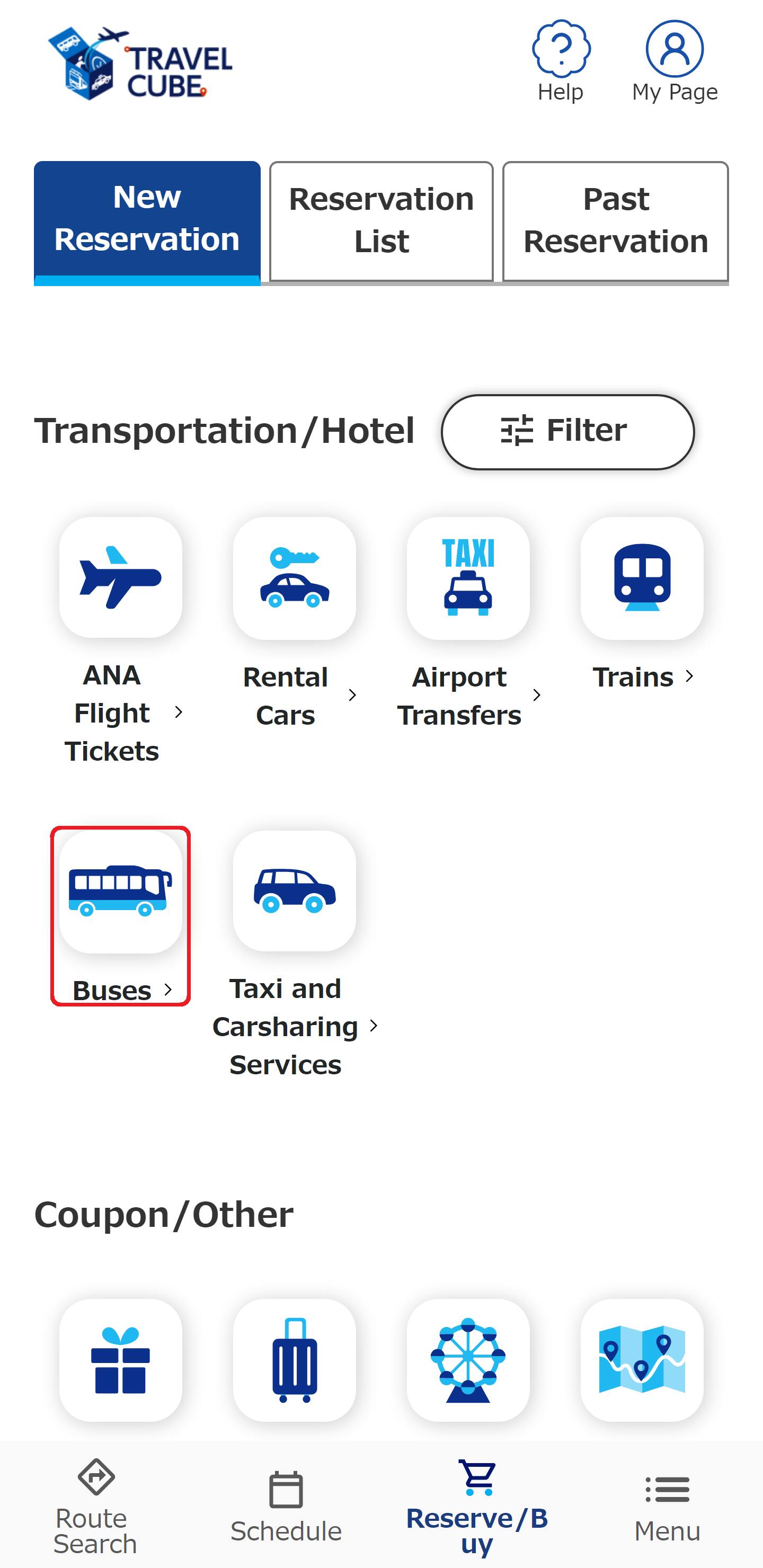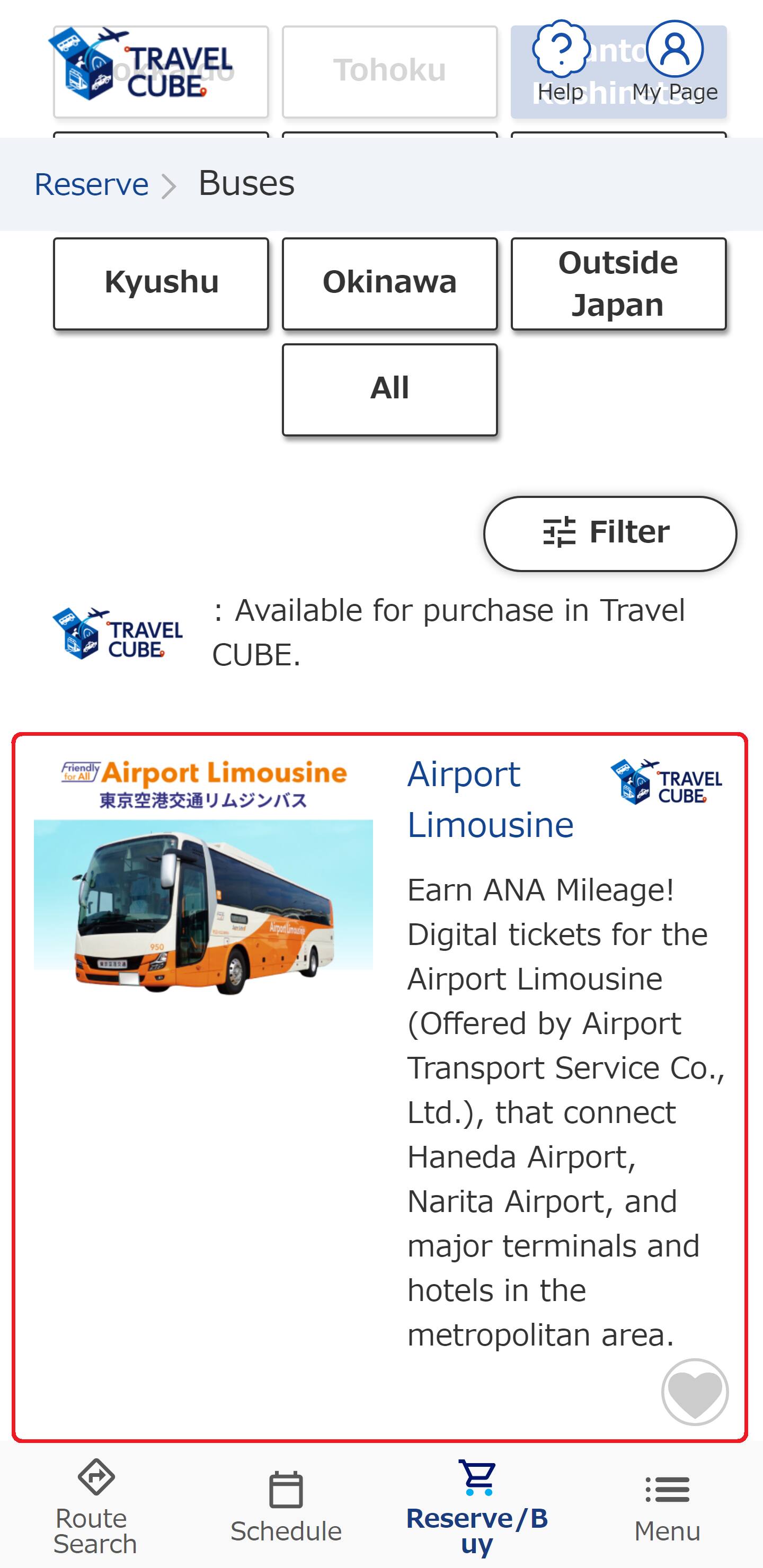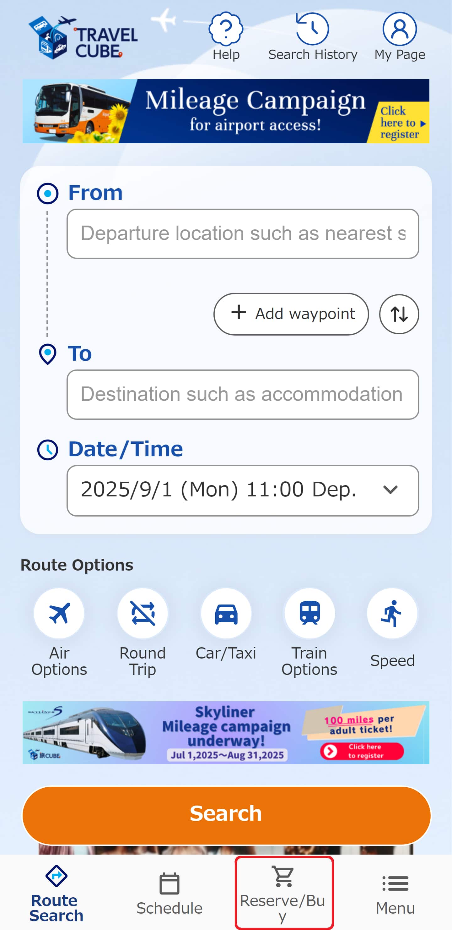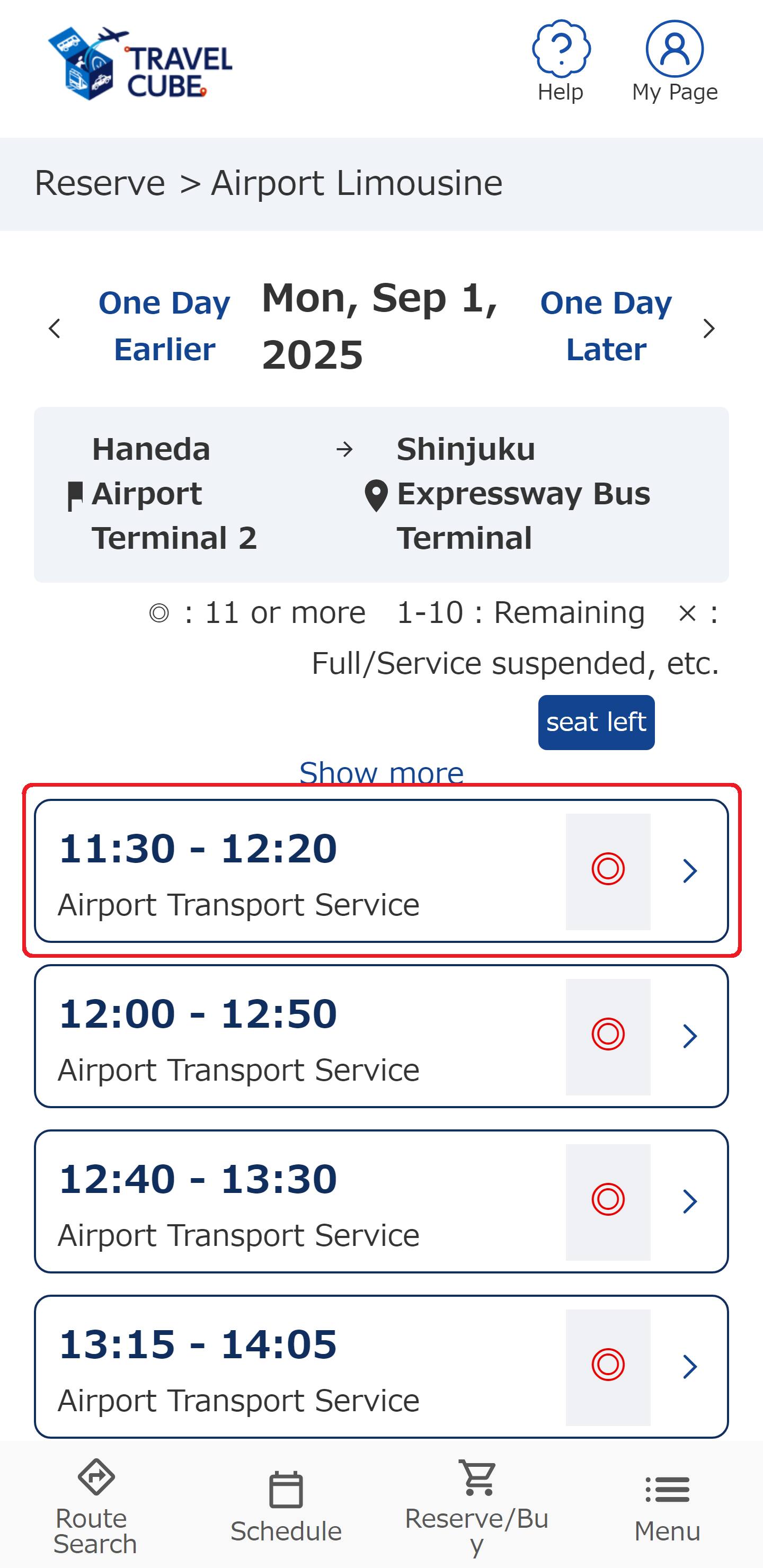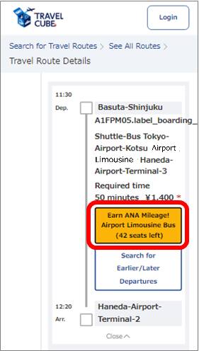 For buses departing in less than five minutes, please purchase your tickets from ticket machines. (Tickets purchased without using Travel CUBE, such as from a ticket machine, are not eligible for mileage accrual.)