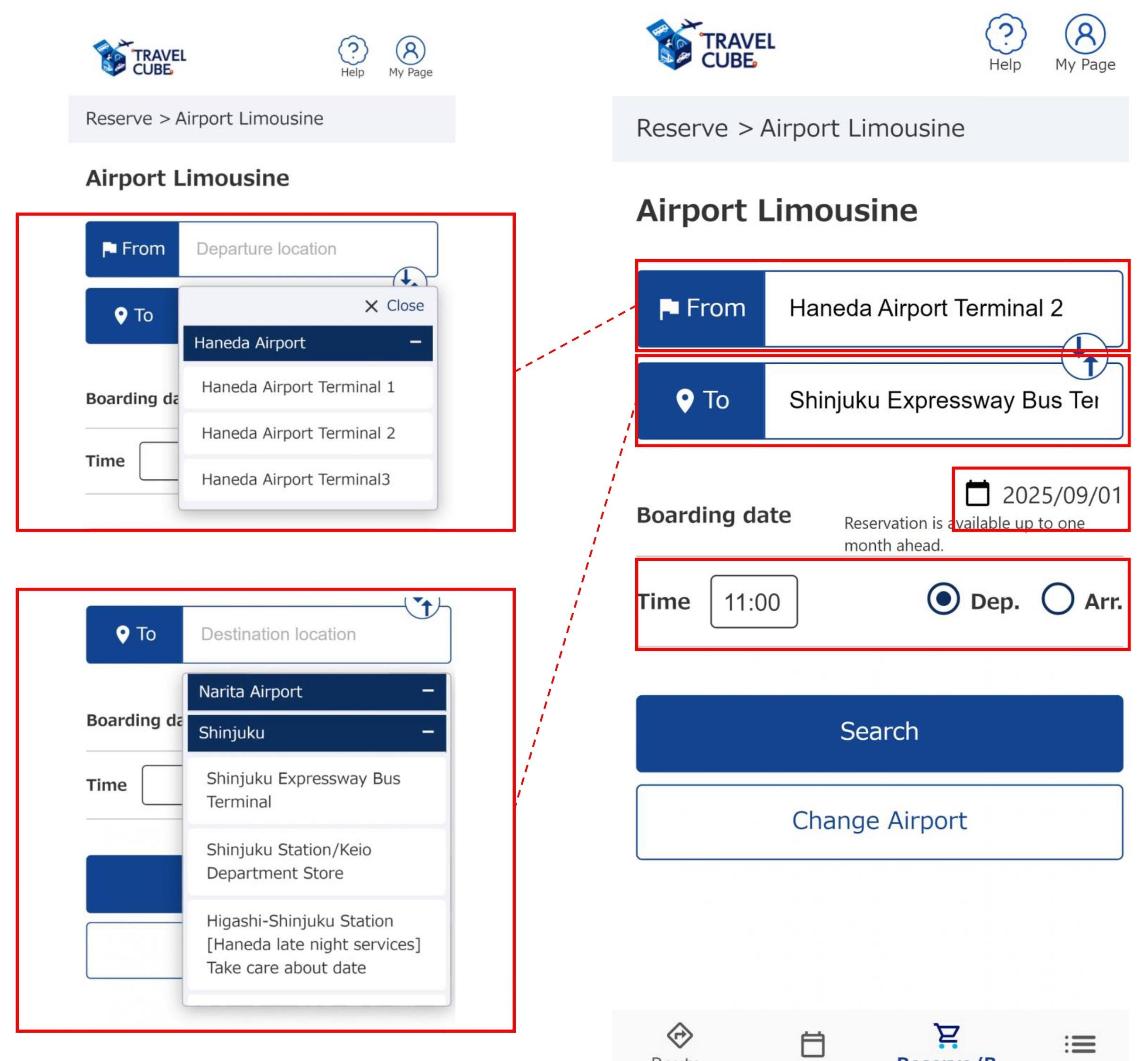 Select the "Departure location" and "Destination location" from the pull-down menu, set the date and time of the ride, and click [Search].
