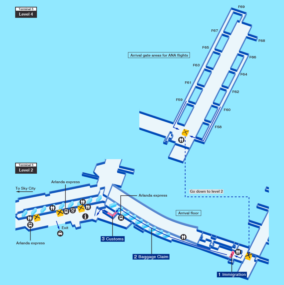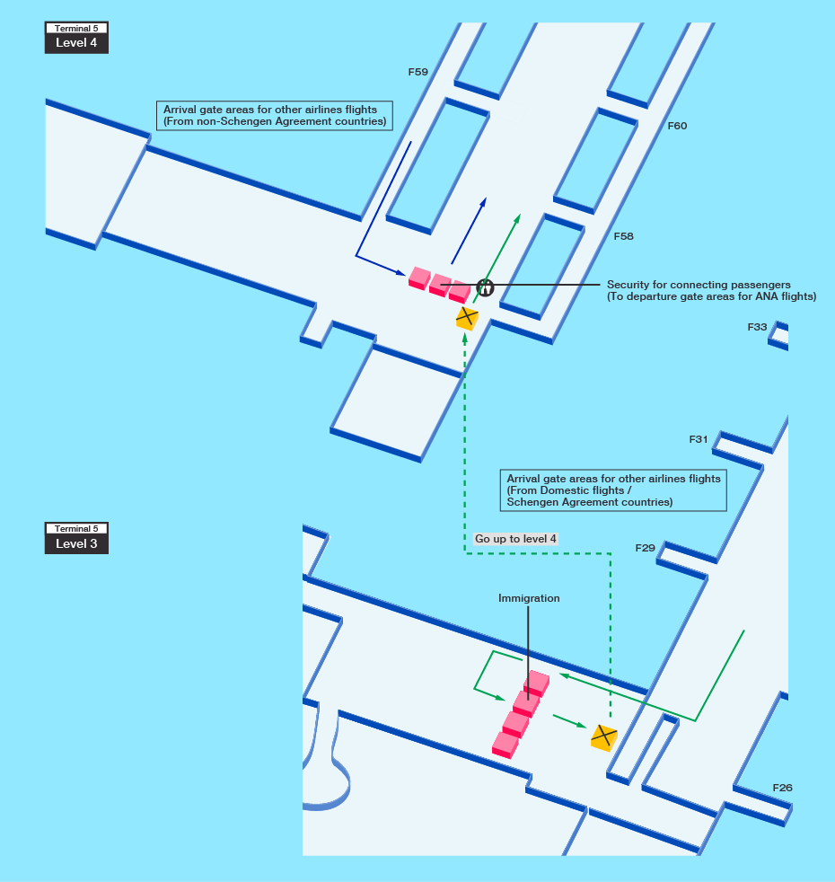 If transferring to a different terminal, please use the free terminal shuttle bus from Gate F5 after passing the transit security check.