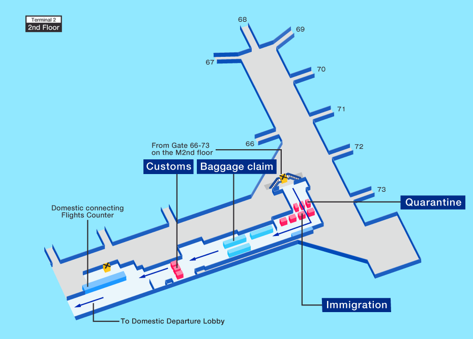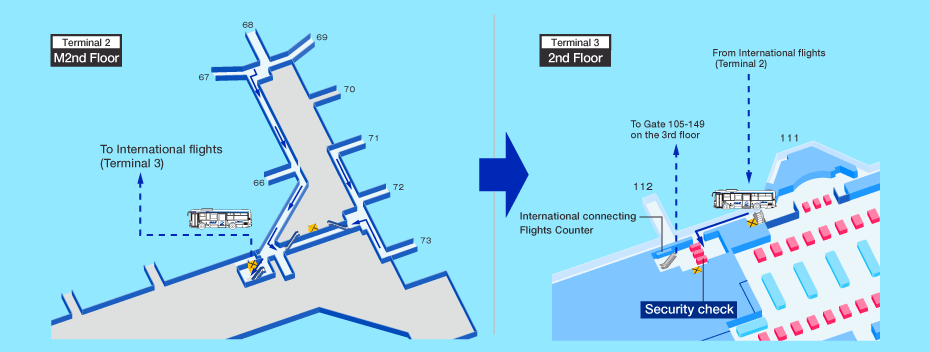 After going through the security checkpoint for domestic flights, please proceed to Terminal 2 using the shuttle bus for connecting passengers.