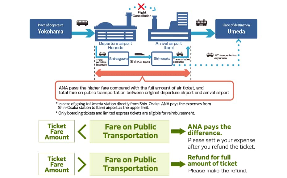 In the case of travel from Haneda Airport to Umeda Station, if the reserved flight from Haneda Airport to Itami Airport is cancelled and you travel from Haneda Airport to Itami Airport via Shinagawa Station and Shin-Osaka Station by regular public transportation, and then to Umeda Station. In addition to the airfare amount, we will pay the difference between the scheduled public transportation fare from Haneda Airport to Itami Airport and the airfare. If you go directly from Shin-Osaka Station to Umeda Station, we will pay up to the cost of travel from Shin-Osaka Station to Itami Airport. If the regular public transportation fare is greater than the airfare amount, ANA will pay the difference. Please settle the bill after the ticket is refunded. If the fare for scheduled public transportation is less than the ticket fare, the full amount of the ticket will be refunded. Please make a refund.
