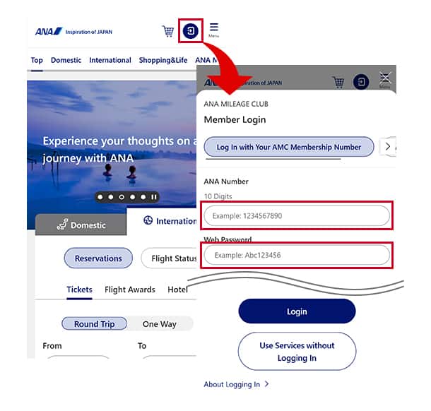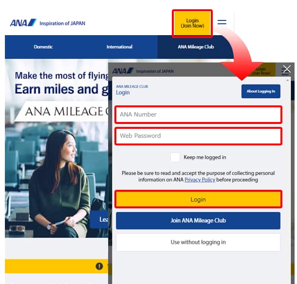 To log in to the ANA website, you will need your 10-digit ANA Mileage Club membership number and web password.
