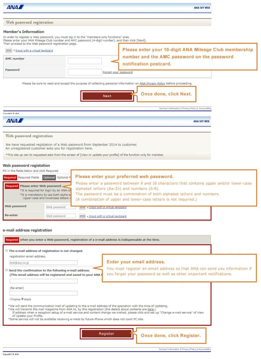 You will require your web password to log into the official ANA homepage (hereafter, ANA website) and perform various procedures, redeem miles, and so on.