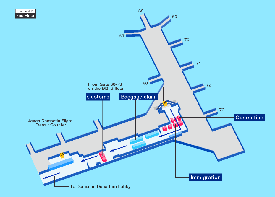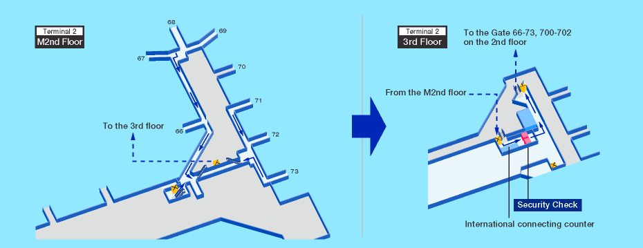 Follow the indications for International Connecting flights (Terminal 2) and take the elevator up to the 3rd floor of departure lobby. Then go through the security check.