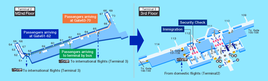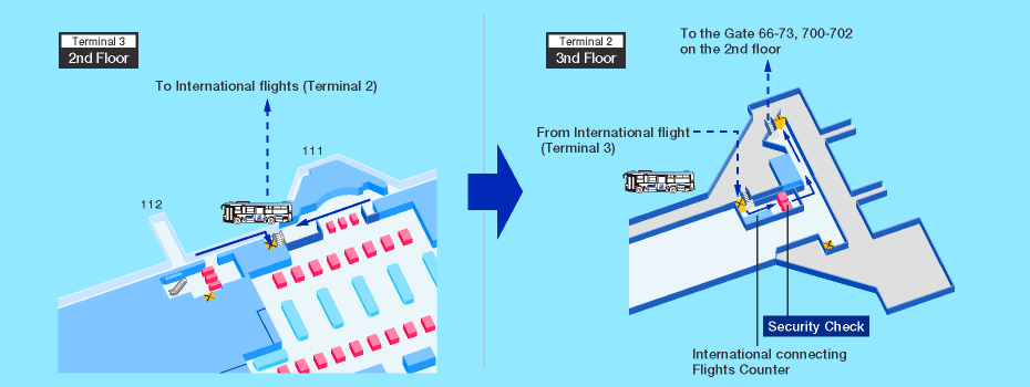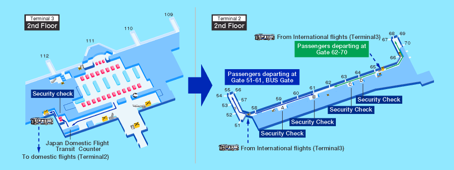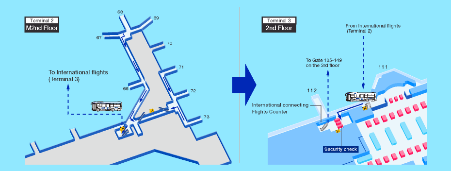 After going through the security checkpoint for domestic flights, please proceed to Terminal 2 using the shuttle bus for connecting passengers.