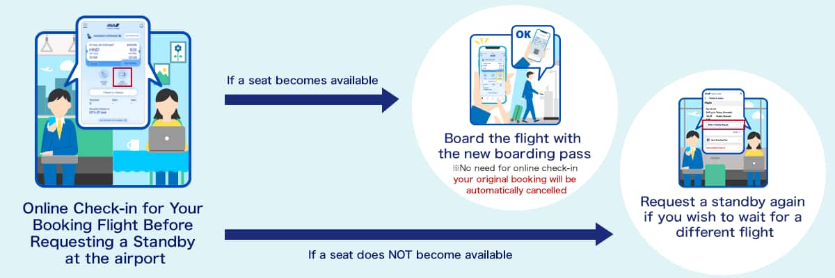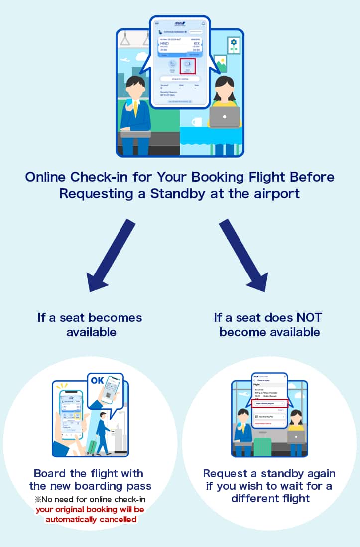 | If Seats Have Assigned | If a seat assigned by an airport standby request, your original reservation will be automatically canceled. * If you decide to fly on your reserved flight, you must cancel your standby request no later than 20 minutes before the departure time of the standby flight. Also, when a seat is available, you will be automatically checked in for the flight. |