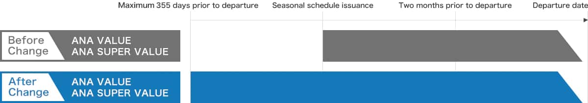 | ANA VALUE, ANA SUPER VALUE, ANA Mileage Club Companion Fare, flight awards | Maximum 355 days prior to the departure date from 09:30 (JST)*1 |