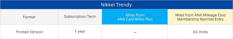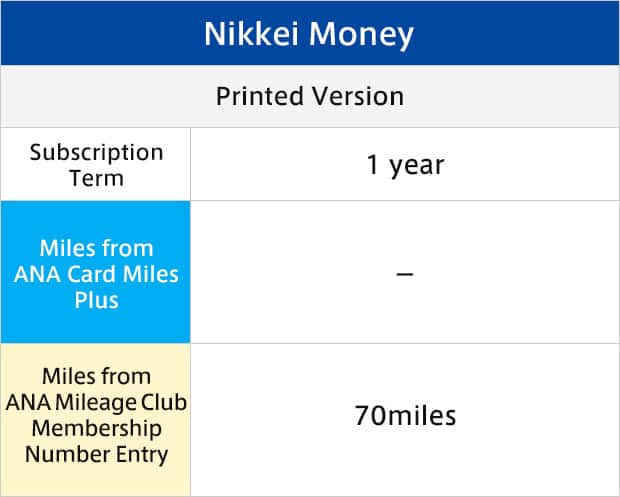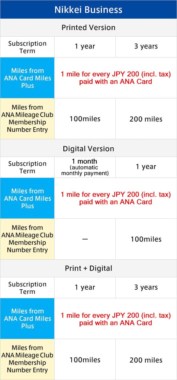 ANA Card cardholders who provide their 10-digit ANA Mileage Club membership number when requesting an annual subscription for Nikkei Business through the website below can earn 1 mile for every JPY 200 (including tax) spent in addition to magazine-specific miles when using an ANA Card for payment.
