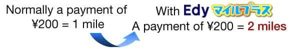 The standard rate when earning miles through Edy purchases is 1 mile for every JPY 200 spent. With Edy Miles Plus, the rate is 2 miles for every JPY 200 spent.