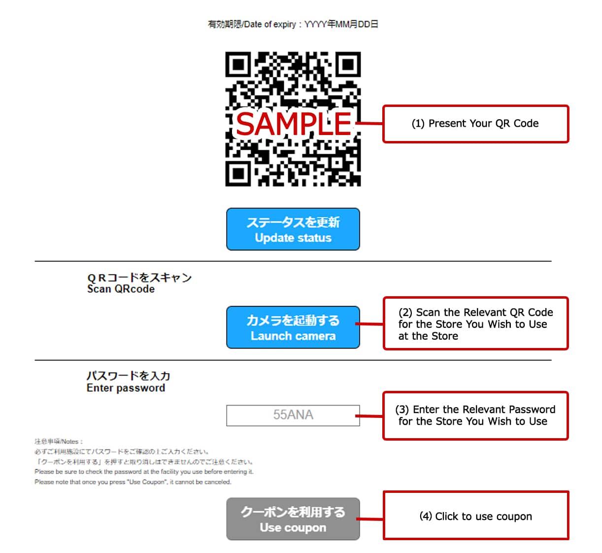 Upon making the payment, use one of the following methods: (1) Display your QR code, (2) scan the QR code at the store, or (3) enter the provided password(4)Click to use coupon