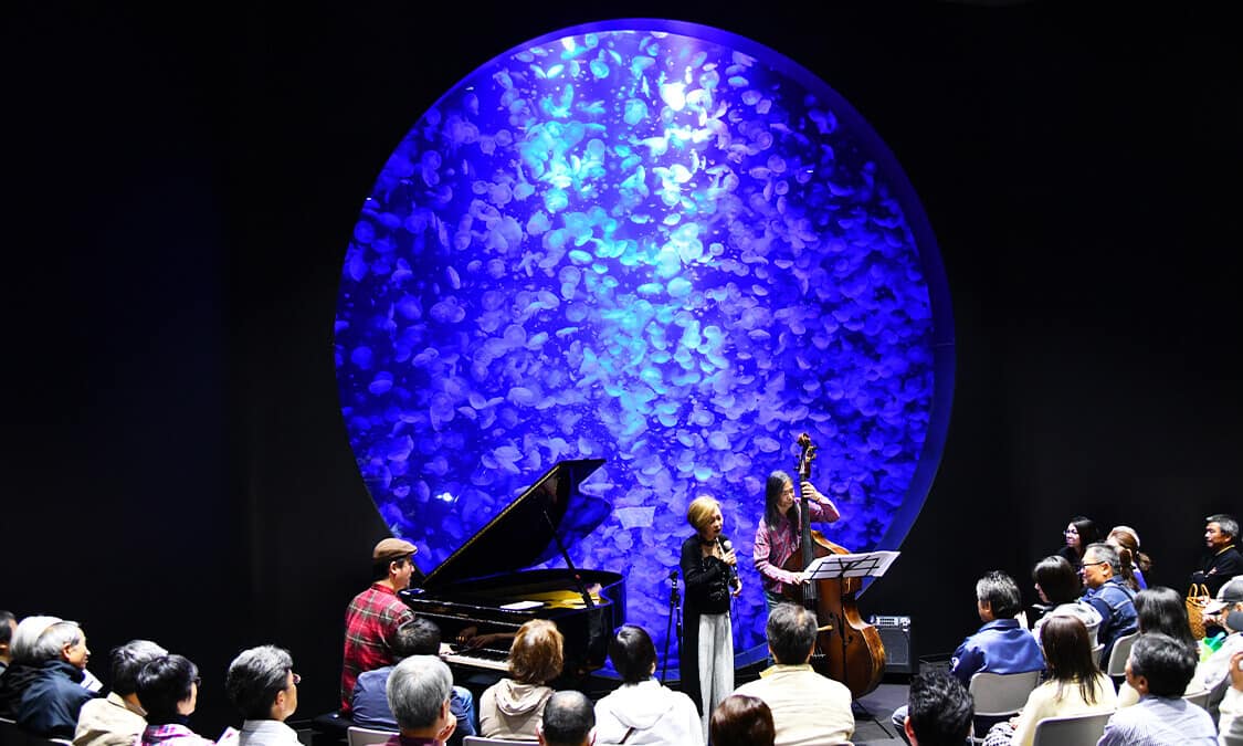Kamo Aquarium offers various unique events that can only be experienced here. In the Evening of Music event, enjoy a fantastical collaboration of jellyfish and music at concerts held in front of the Jellyfish Dream Theater. Another unique event is the overnight stay in the aquarium, where you can spend a special night in front of the fish and jellyfish tanks. In the backyard tour, aquarium staff will take you on an exclusive tour to the other side of the tank that is normally closed to visitors.