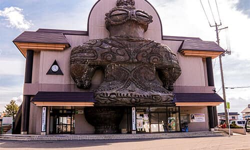 "Dogu" are clay figurines made during the late Jomon period (3000-200 BC) of prehistoric age in Japan. Kizukuri Station in Tsugaru City in Aomori Prefecture has a gigantic "Shakoki-dogu" statue built into its facade. The 7.3-meter statue is not only eye-catching for its massive size but also famous for the so-called "welcome beam," or the red flash its eyes emit every time a train arrives. Nicknamed "Shako-chan," the statue imitates the shape of a Shakoki-dogu figurine excavated from the Kamegaoka site in Aomori.