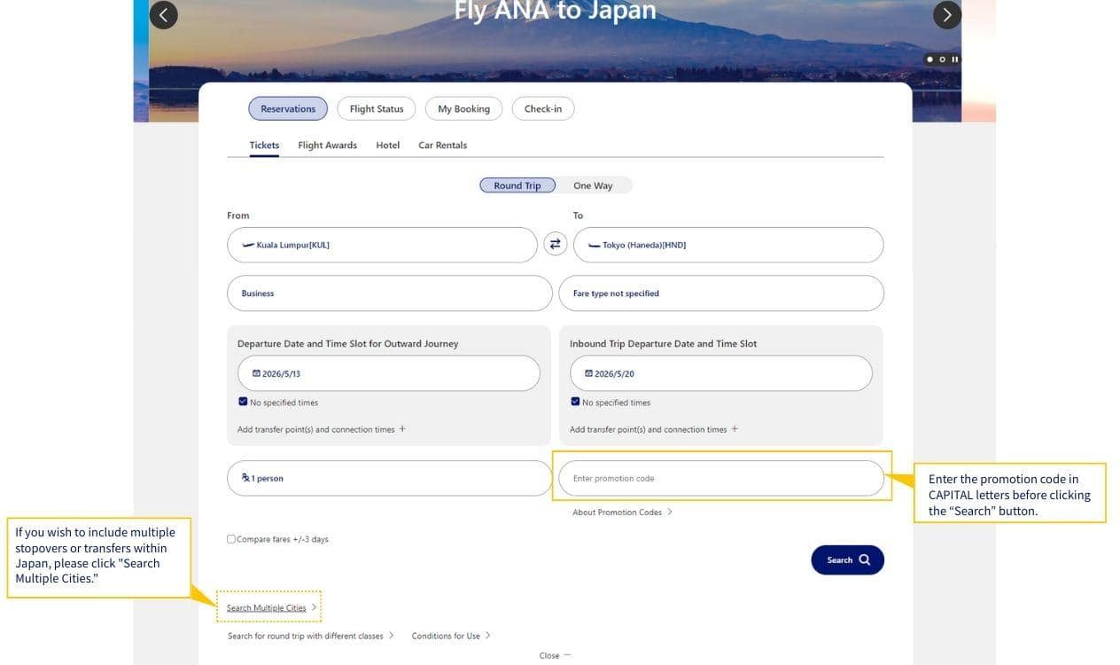 Go to the ANA Malaysia website (ana.co.jp/en/my/) and click on "open+" to expand the section where you can enter the promo code (in CAPITAL letters). For Multi-City itineraries, please click on "Search Multiple Cities itinerary."
