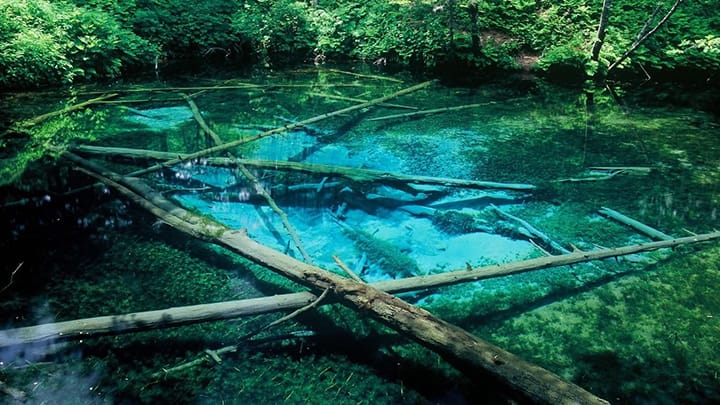 A beautiful pond formed by water which springs out from the bottom of Lake Mashu and shrouded in mysterious cobalt blue. The water is so clear that fallen trees at the pond bottom are visible.