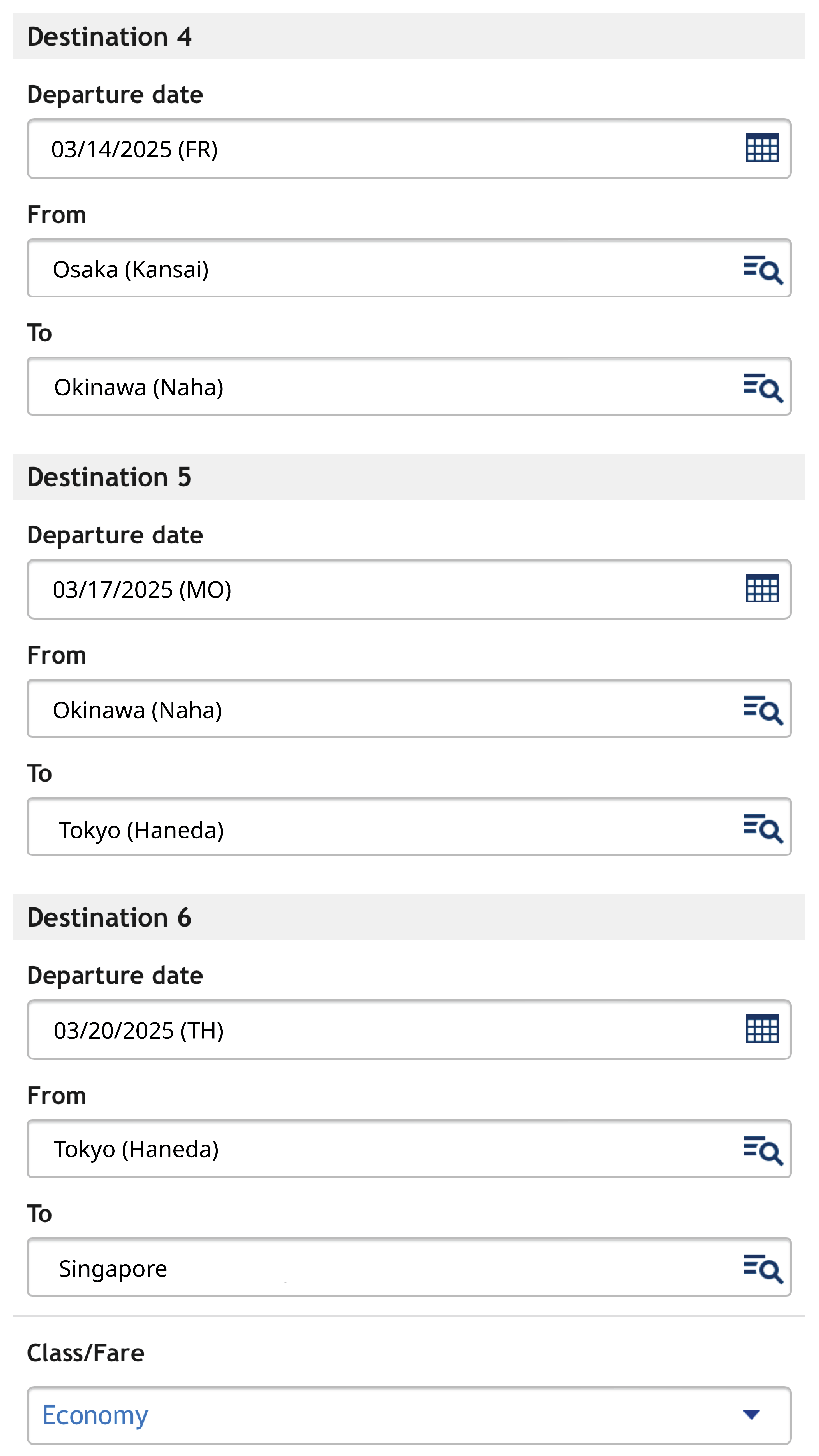 2. Input your travel dates and destinations respectively, ending with your flight home. Check your itinerary, select 'Search'.