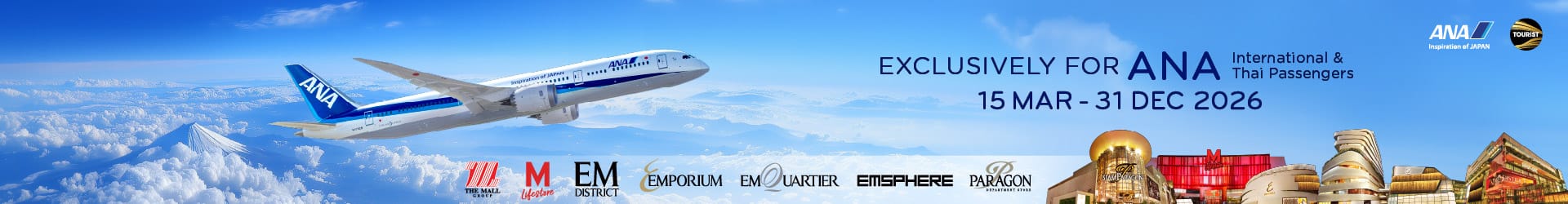 Simply present your ANA boarding pass boarding pass (valid within 3 months from the arrival date of your international flight) together with your Thai ID card at the designated Department Store counters below to receive a 150 THB Cash Coupon with a minimum spend of 1,500 THB per receipt: