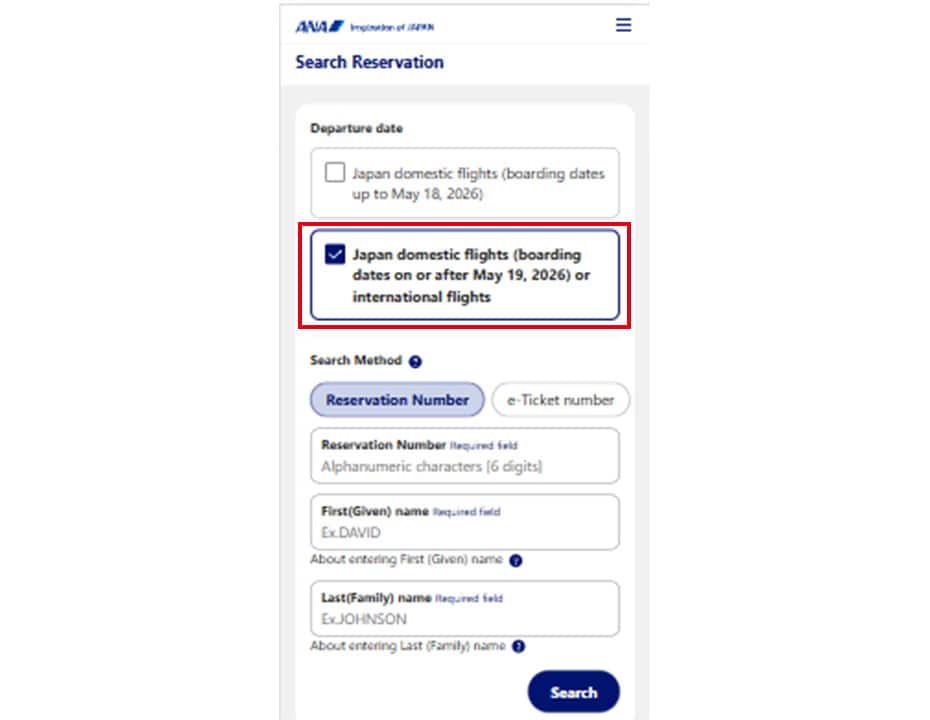 For domestic flights within Japan (for flights departing on or after May 19, 2026), check the "Checkbox," enter your "Reservation Number, First Name, Last Name," and search for the reservation of the flight you wish to transfer to.
