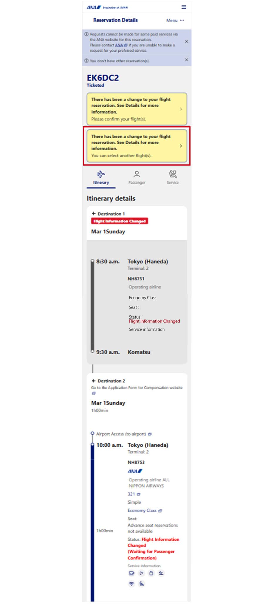 Changes have been made to your reserved flight. Please review the details. You can change to another flight. Select this option.