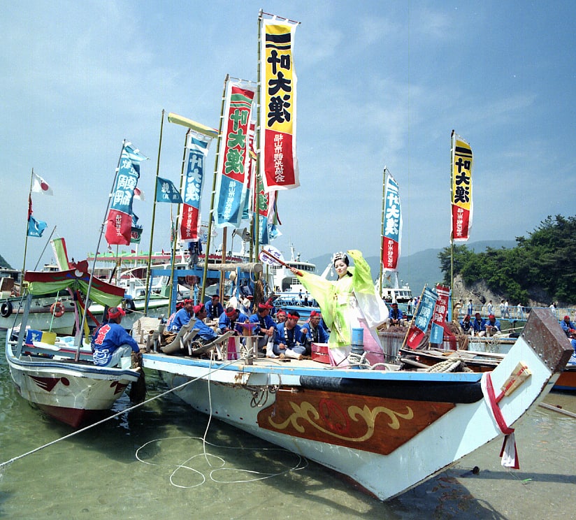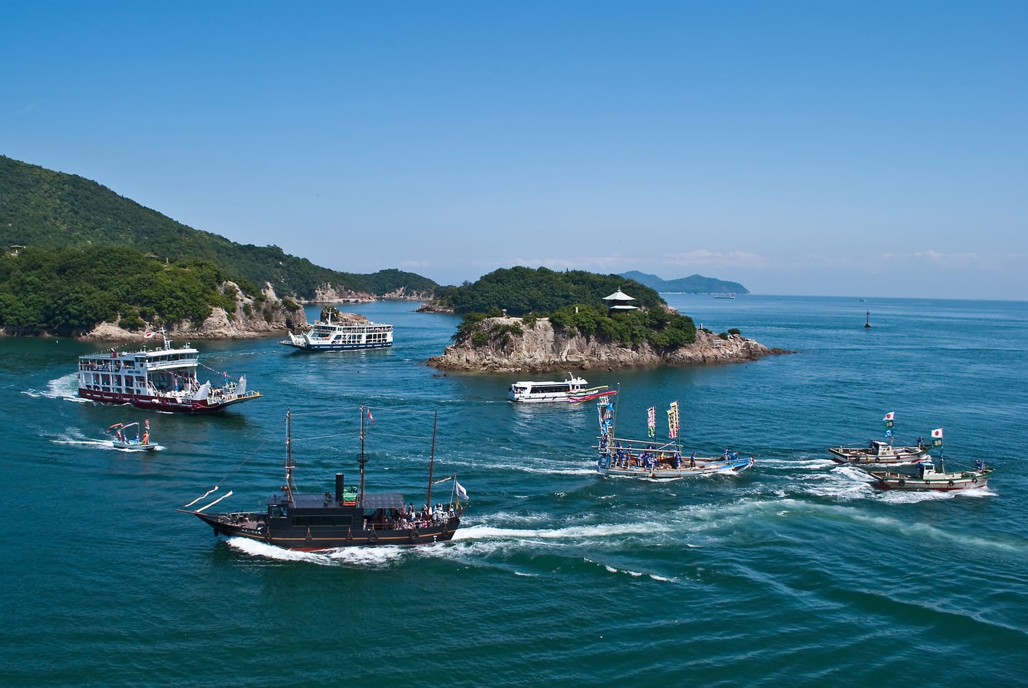 Sea bream net-fishing is a fishing technique passed down for around 380 years. Sea breams spend the winter out in the open seas, and come to the bay of Tomonoura to lay eggs in early spring. In May every year, you can watch a net-fishing technique whereby fishermen wait for a school of fish and catch them all with one net. This technique was devised in the early Edo period.