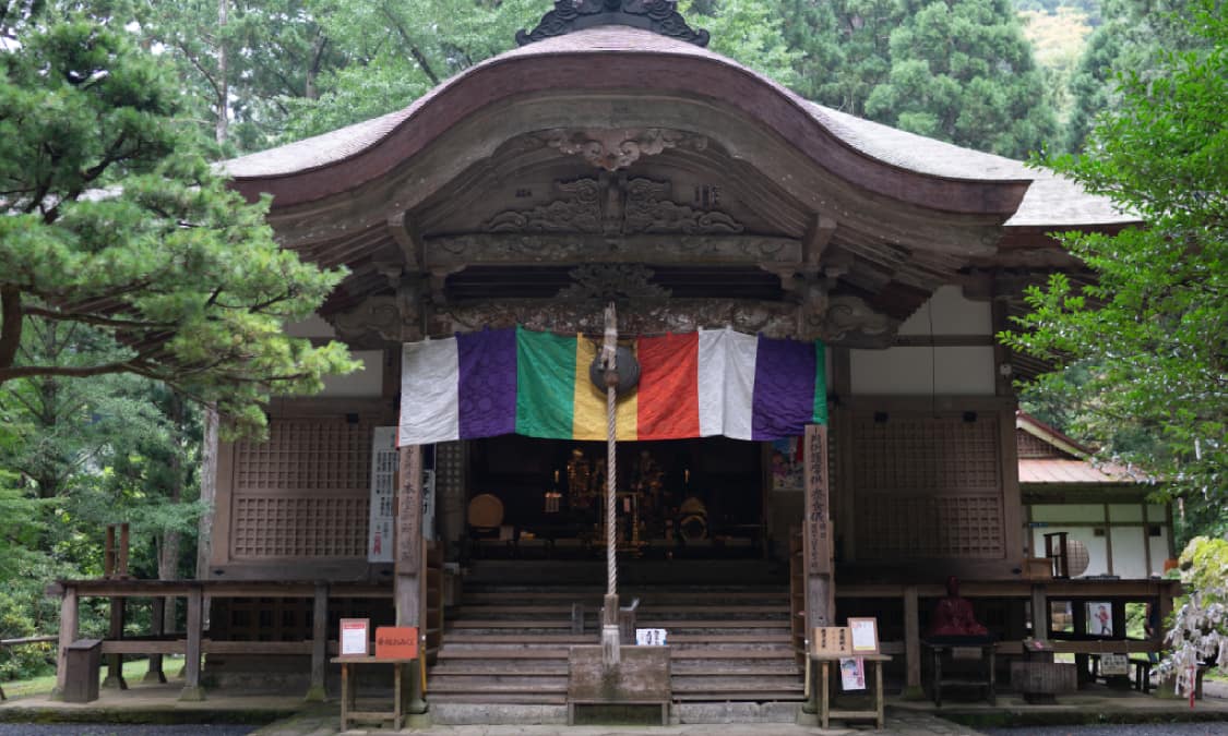 There are several temple halls at the base of the mountain, but the main attraction is Nageiredo Hall. Sitting on a series of wooden poles clinging onto the rocky mountain wall at an elevation of 500m, this is a really unique structure. With the curvatures of its roof and the structure of its pillars it excels as a beautiful work of architecture, and it has also been designated as a National Treasure. Legend says "En-no-Gyoja", the founder of the ascetic training practice called Shugendo, tossed the hall from the base of the mountain and it landed in its current resting place.