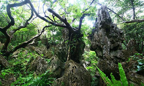 Daisekirinzan was created by limestone formed in the sea in the Paleozoic era around 250 million years ago, which appeared on the surface due to crustal movement. Over another several million years, the limestone was further eroded by winds and rain, and a unique landscape of sharp, strangely shaped rocks was created. This rocky mountain has been here since the main island of Okinawa first began to form. Even today, rainwater and bacteria are melting the limestone and continuously changing the landscape of the mountain.