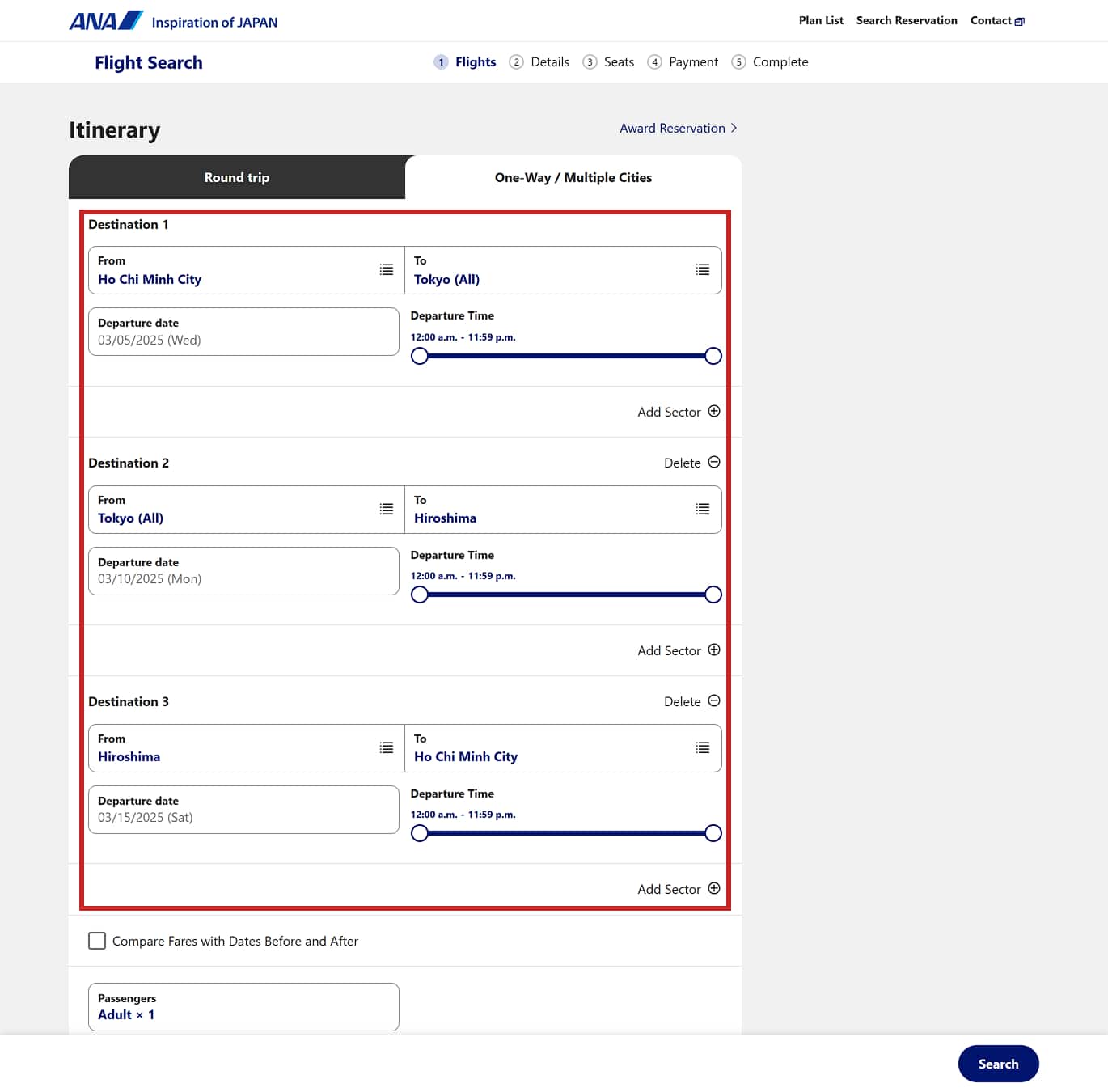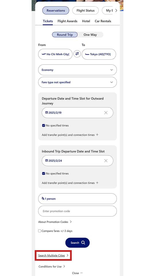 1. Head over to ANA website and click 'Search Multiple Cities'.