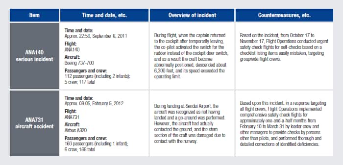 In the fiscal year ended March 2012, there were seven cases of aircraft accidents and serious incidents involving the ANA Group. Although the serious incidents included two events that were not caused by the ANA Group, the number of cases exceeded the norm. In particular, the September 6, 2011 serious incident involving ANA140, the February 5, 2012 aircraft accident involving ANA731, and the June 20, 2012 aircraft accident involving ANA956
