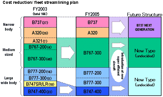 As Future Narrow Body Aircraft Type TOKYO, April 9, 2003 - ANA (All Nippon Airways) has completed an extensive review of its long-term narrow body aircraft requirements, and has determined that the Next-Generation Boeing 737 will best meet its goal to reduce operating costs. ANA selected the Boeing aircraft for reasons of efficiency and economy, and its fit with the ANA domestic route network, among other factors. The decision will lead to the eventual replacement of the present ANA Group narrow body fleet of 52 aircraft -- 25 Airbus A320s, two Boeing 737-400s and 25 737-500s operated by ANA and Air Nippon (ANK) -- with an estimated 45 Boeing 737s, mainly 737-700s but also including other variants. CFM56-7 engines manufactured by CFMI, a joint venture of General Electric and SNECMA of France, will power these aircraft. This streamlining of the ANA narrow body fleet into a single aircraft type is expected to begin in fiscal 2005 (April 1, 2005-March 31, 2006), and the estimated 45 aircraft will result in savings of approximately ¥6 billion per year ($50.6 million at U.S.$1 = JPY120). This is a further stage in the plan to cut operating costs. From fiscal 2003 to 2005 ANA will reduce the number of large wide body aircraft types from four to three -- Boeing 747-400s, 777-200s and 300s -- and consolidate medium sized aircraft types into one -- the Boeing 767-300. The resultant savings will be approximately ¥10 billion per annum. ANA will continue to monitor long-term technological developments within the medium and large sized aircraft market for opportunities to secure even greater cost savings. ANA Group airlines currently operate 166 Boeing 747s, 777s, 767s, 737s and Airbus A320/321 aircraft. |