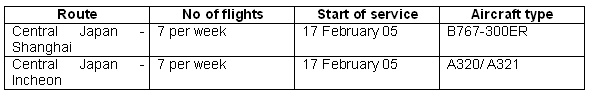 14 flights per week to Shanghai and Seoul (Incheon) from Central Japan International Airport when it opens in February 2005. |