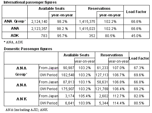 TOKYO, April 21, 2005-ANA Group is forecasting increased passenger numbers for this year’s Golden Week holiday period, which falls from Thursday, April 28 to Sunday, May 8. Domestic reservations are up two percentage points, and international reservations by seven percentage points compared with Golden Week of the previous year. Despite fewer available seats on domestic routes due to aircraft downsizing, reservations are higher than last year, a fact attributed in part to the opening of the new Haneda Terminal 2 in December last year, and Central Japan International Airport in Nagoya, in February this year. Internationally, reservations and available seats are up year-on-year. European and North American destinations are particularly popular this year, aided by the favorable days of the week on which the holidays fall. Golden Week is one of Japan’s most famous holiday periods and encompasses a series of four national holidays: Green Day, Constitution Day, Citizen’s Day and Children’s Day. ANA Group consists of the following six airlines: ANA (All Nippon Airways), Air Nippon (ANK), Air Japan (AJX), Air Nippon Network (A-Net), Air Hokkaido (ADK) and Air Central (CRF). |
